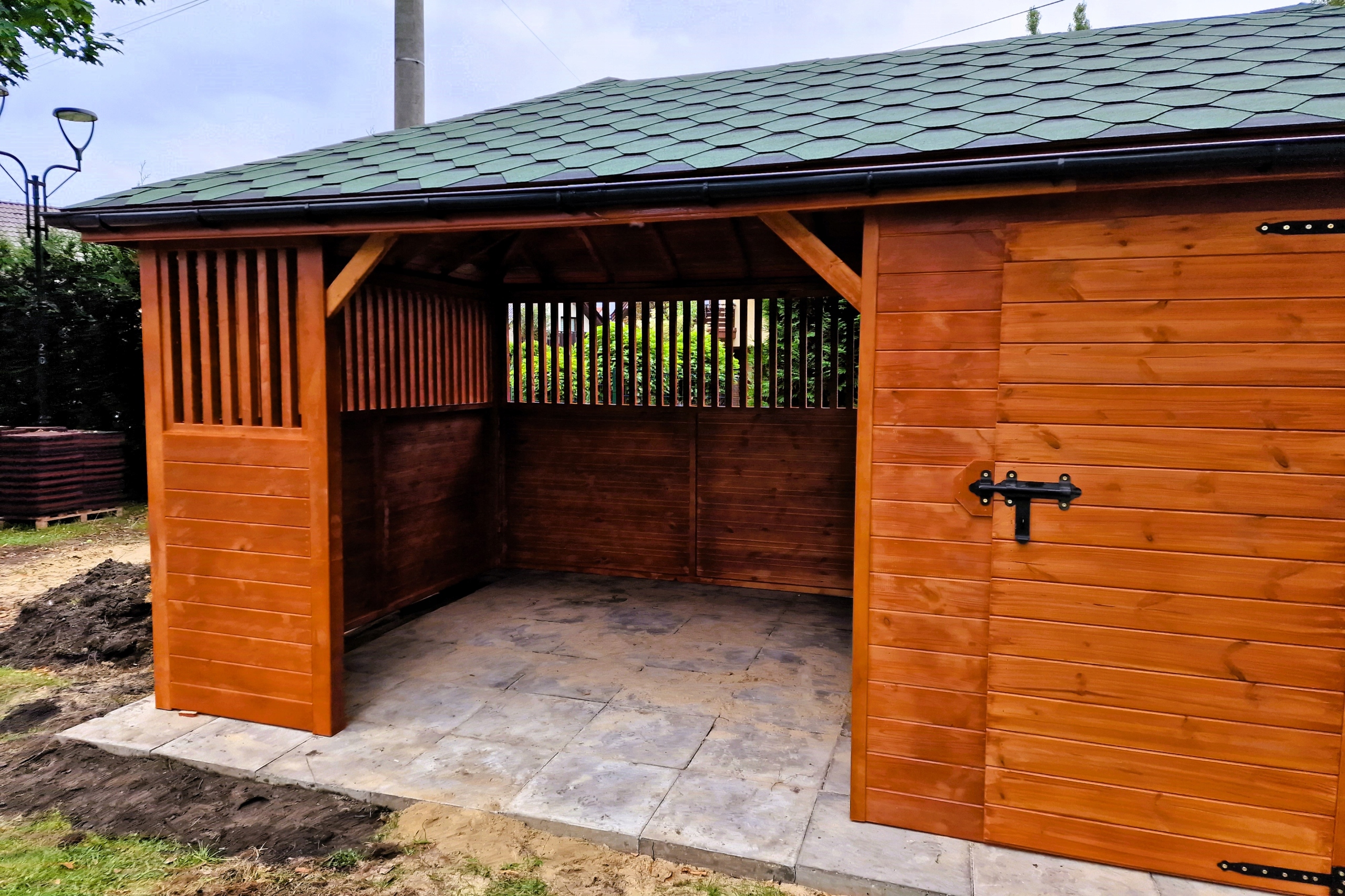 Domek narzędziowy z zabudowaną dużą drewutnią, drewniany domek