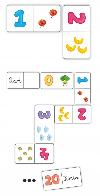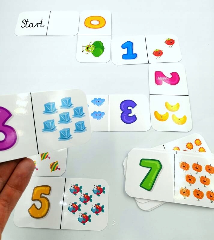 Навчальна допомога для вивчення та відпрацювання знань цифр і чисел. Завдання полягає в тому, щоб розкласти картки доміно таким чином, щоб біля заданої картинки стояла цифра, яка відповідає кількості елементів на картинці.