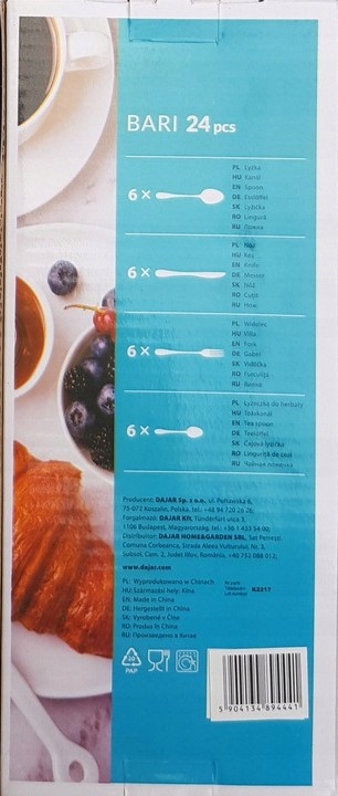 Просматривая «DOMOTTI - 24-ELE. НАБІР СТОЛОВИХ ПРИБОРОВ BARI», вы можете быть уверены, что данный товар из каталога «Наборы столовых приборов» будет доставлен из Польши и проверен на целостность. В цене товара, указанной на сайте, учтена доставка из Польши. Внимание!!! Товары для Евросоюза, согласно законодательству стран Евросоюза, могут отличаться упаковкой или наполнением.