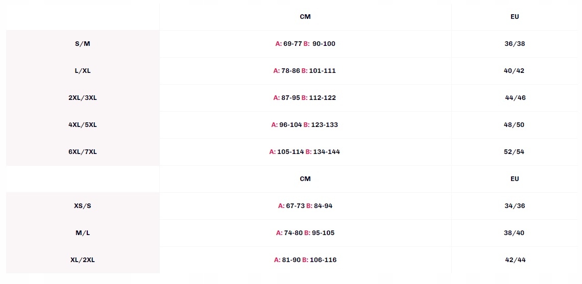 Таблиця розмірів: A: Нижня частина грудей B: Стегна EU: розмір ЄС