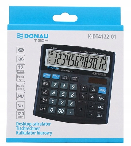 калькулятор офісу Donau Tech K-DT4122 оснащений 12-цифровим дисплеєм і акумуляторним силовим постачанням . Він має функції квадратного елемента, обчислення відсотків, обчислення маржі (MU), обчислення податків (податок =+ податок), перевірте та виправити функцію (перевірити та виправити), подвійний нуль та пам'ять. калькулятор автоматично вимикається , що економить енергію. Посібник користувача доступний у польській мові.