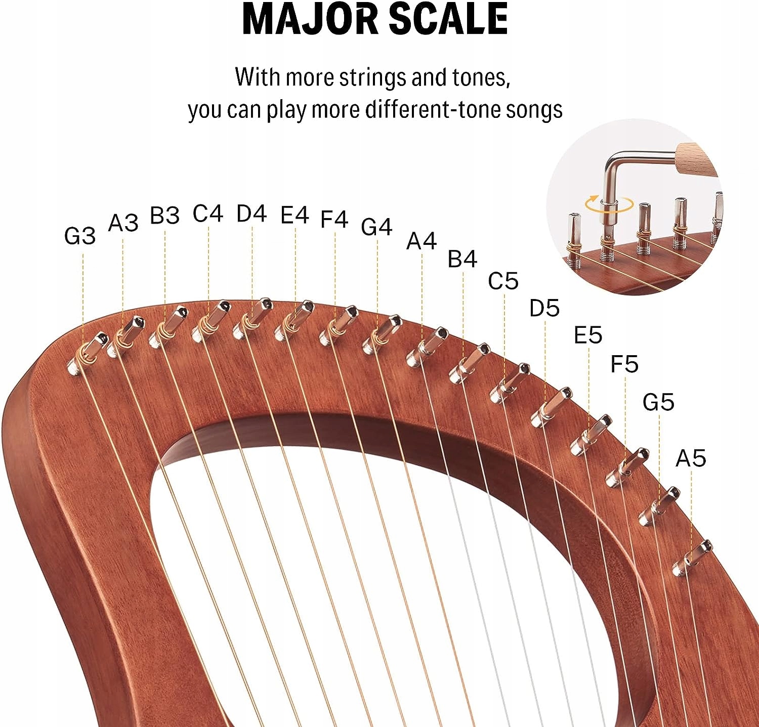 16-струнна лірова арфа Доннера виготовлена з міцної звукової коробки з червоного дерева та клавіш з вуглецевої сталі для кращого звуку. До комплекту входить чорна сумка високої щільності, тож ви можете взяти свій концерт куди завгодно. Крім того, арфа Donner Lyre постачається з ключем, набором струн та інструкцією (може бути недоступною польською мовою).