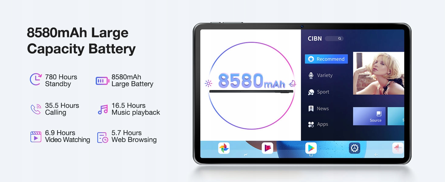планшет Doogee T30SE з Android 14, оснащеним вбудованим акумулятором потужністю 8580 мАг, забудьте про страх вичерпання акумулятора. При повсякденному використанні однієї зарядки достатньо на 2,4 дні. Завдяки функції системи управління сном, система управління акумуляторами також можлива для тривалого режиму очікування до 80 днів.