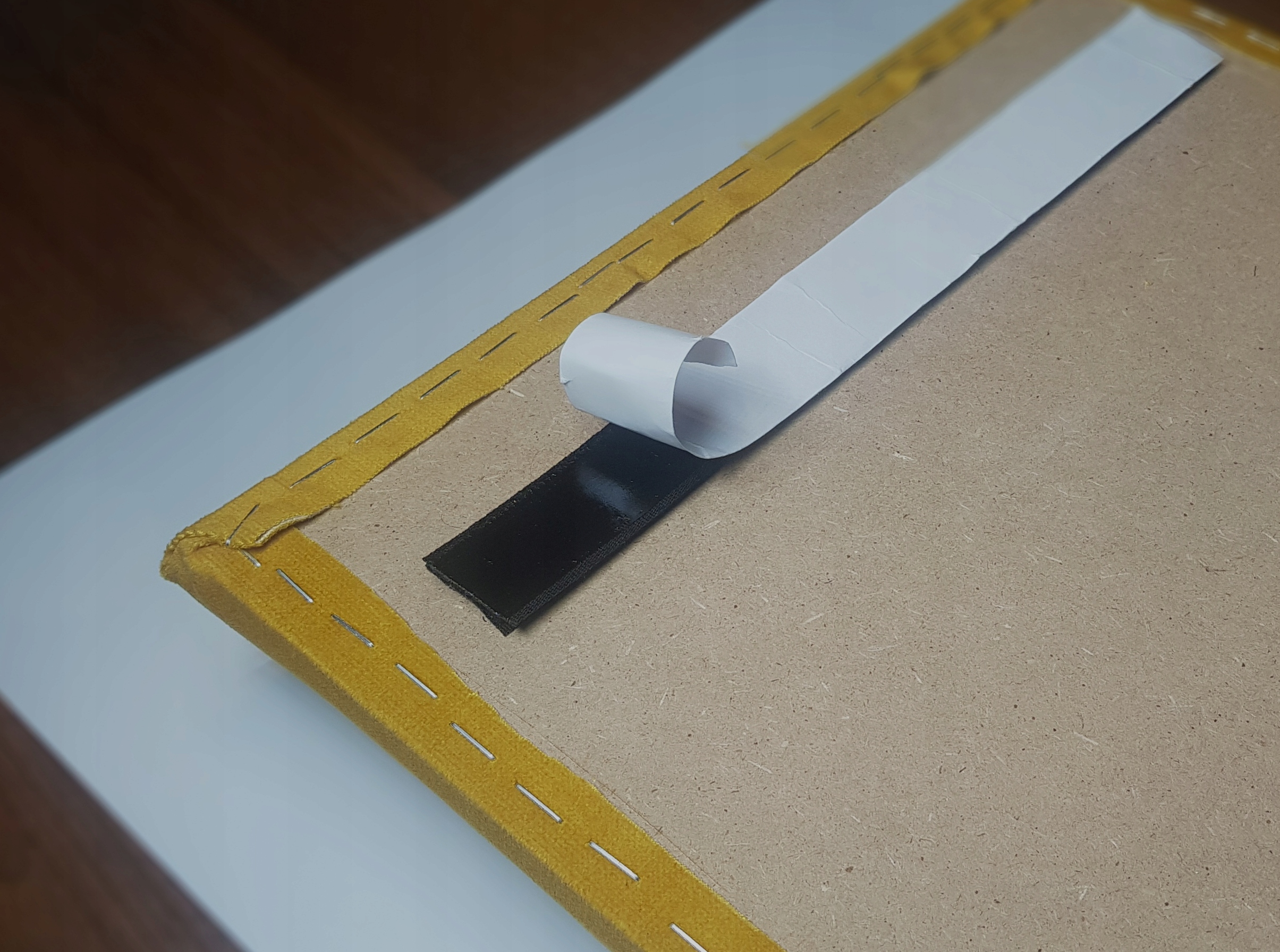 Для повного полегшення монтажу оббивних панелей ми пропонуємо самоклеючі монтажні липучки. Єдине, що потрібно зробити, щоб встановити панель, це зняти захисну стрічку, а потім поставити панель на стіну.