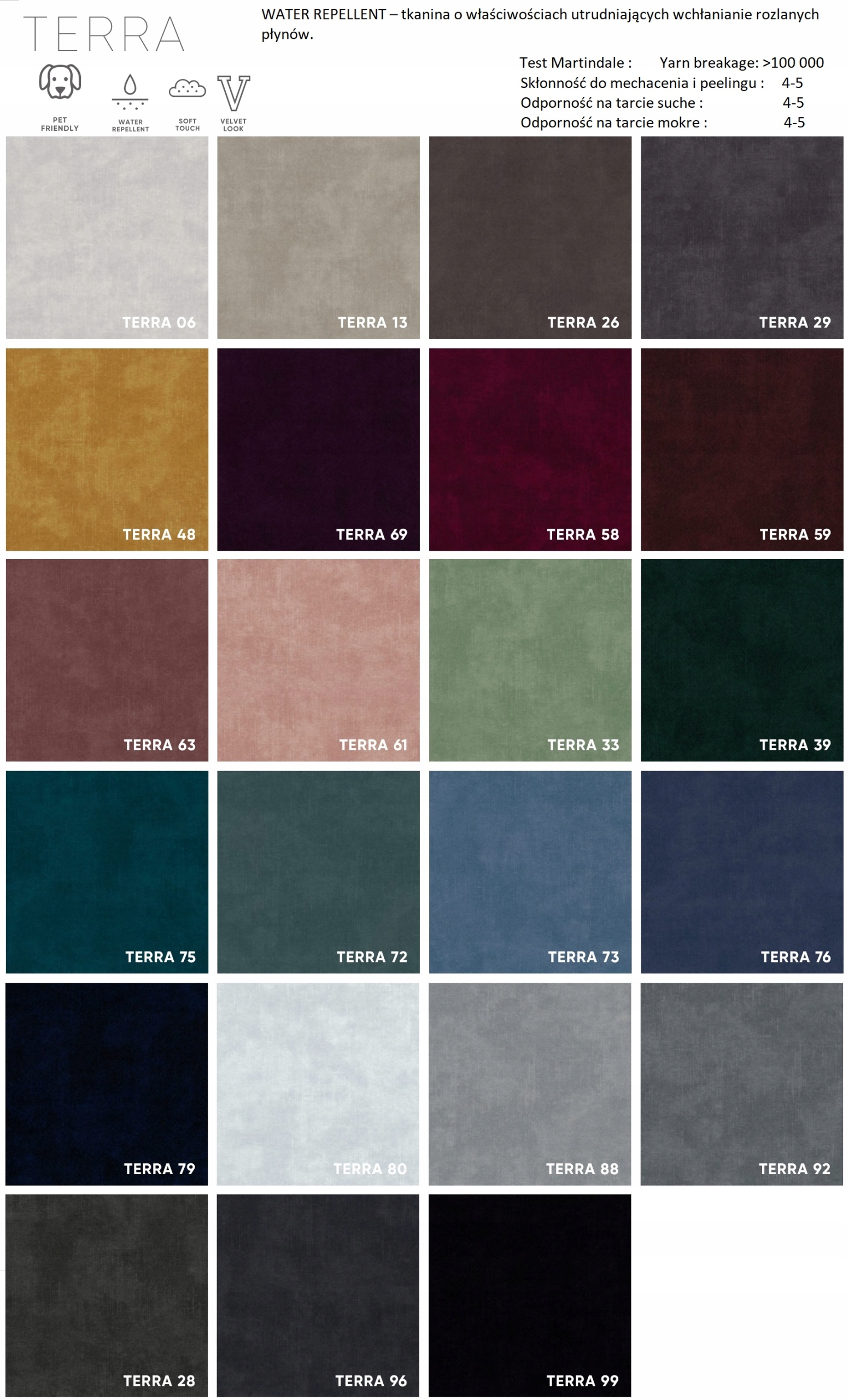 Тканина TERRA покрита спеціальним захисним шаром, що створює гідрофобне покриття, яке перешкоджає швидкому проникненню рідини. Це запобігає миттєвому вбиранню води тканиною, що призводить до конденсації рідини на поверхні матеріалу. Це дає нам час, щоб обережно видалити розлиту рідину за допомогою м’якої тканини або паперового рушника.