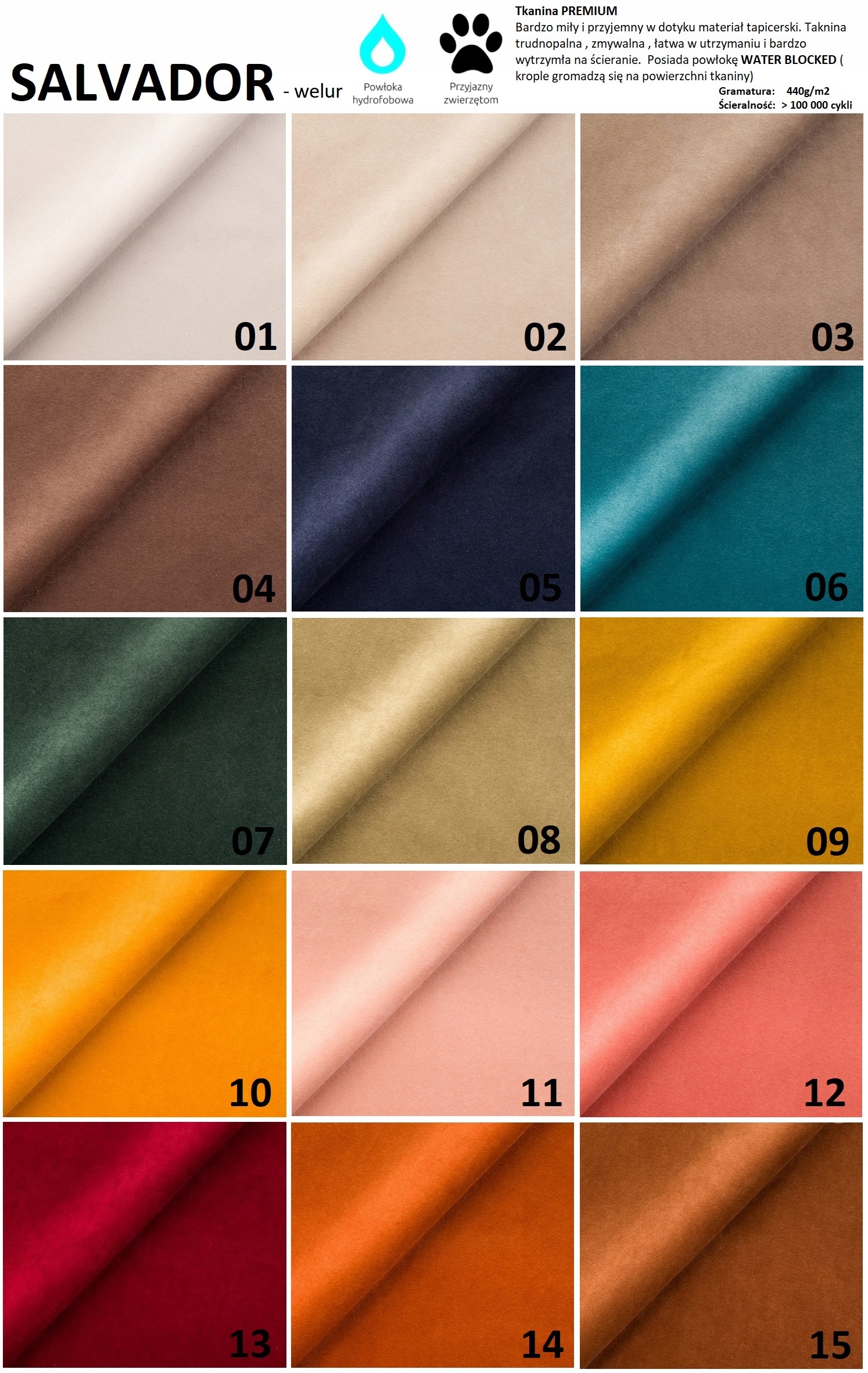 Колекція Salvador - це дуже гарний і приємний на дотик м'ясистий оксамит красивих кольорів. Характеризується високою міцністю і технологією LIQUID BLOCKED. Тканина вогнестійка, її можна прати, вона проста в догляді та дуже стійка до стирання.
