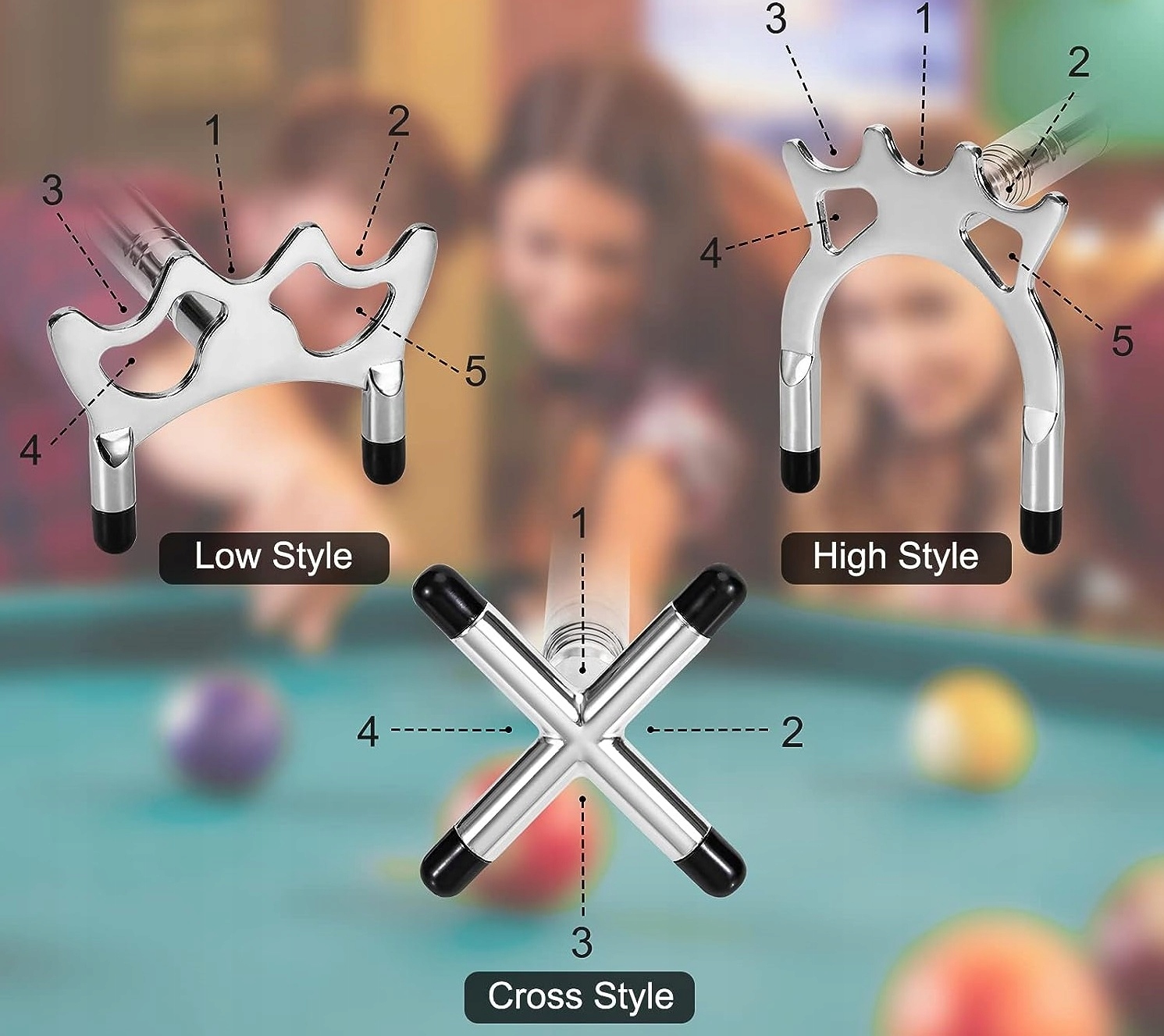 Набір також включає унікальну базу 3 в 1, яка виконує три різні функції. По-перше, він діє як стабільний штатив для опорної палиці, забезпечуючи впевненість і комфорт під час налаштування пострілу. По-друге, він служить практичним тримачем для основної ручки, забезпечуючи зручний доступ до інструменту. По-третє, основу можна використовувати як аксесуар для зберігання додаткових київ або інших аксесуарів для більярду.