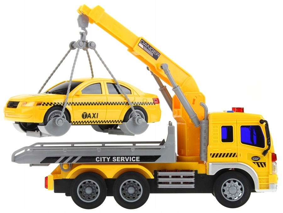 допомога на дорозі з фрикційним приводом готова до роботи! Евакуатор оснащений безпечними гумовими шинами та краном з транспортною рампою, завдяки чому автомобіль легко заїжджає на рампу або затягується. На даху є звуковий і світловий модуль, який забезпечить багато годин радісного задоволення. Просто ввімкніть сирену і вперед. Тепер він зможе рятувати машини, які зламалися і потребують допомоги механіка.