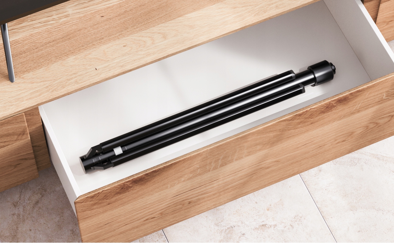 Підставка має складні ніжки, що дозволяє зручно згорнути його, щоб легко зберігання, коли він не використовується. Ця конструкція допомагає максимізувати простір, гарантуючи, що підставка можна ретельно приховувати.