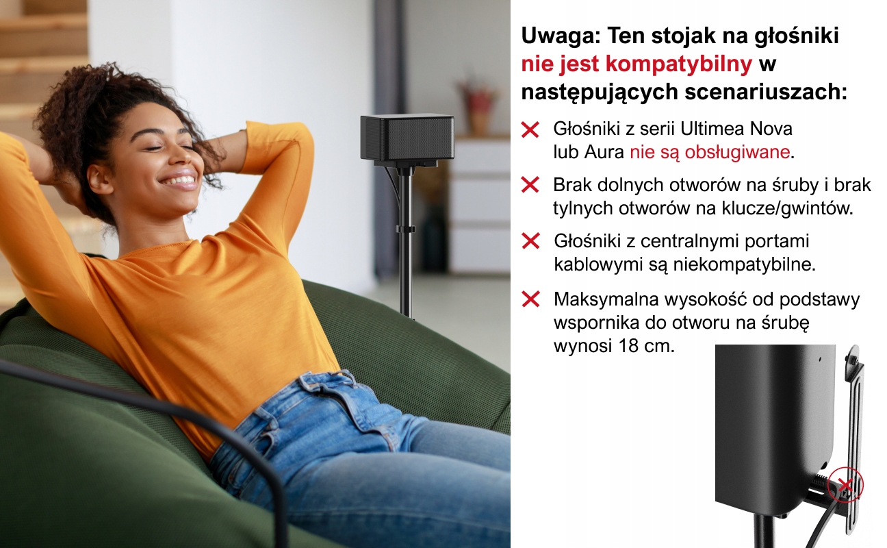 Підставка динаміків має три суцільні ноги, щоб запобігти нахилу і підтримує до 3 кг, забезпечуючи стабільність на різних поверхнях, від твердої деревини до килима. Це ідеальний вибір для будь -якої конфігурації.