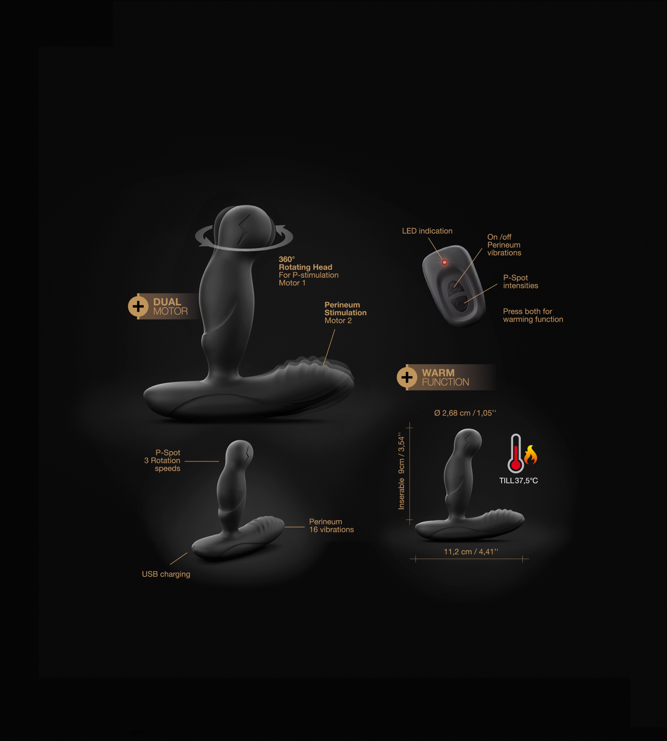Голова P-Shot виконує поворотні рухи 360 °, забезпечуючи надзвичайно сильну стимуляцію. Крім того, пристрій має інтелектуальну функцію опалення (до 37,5 ° C).