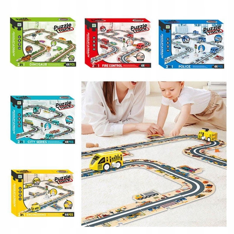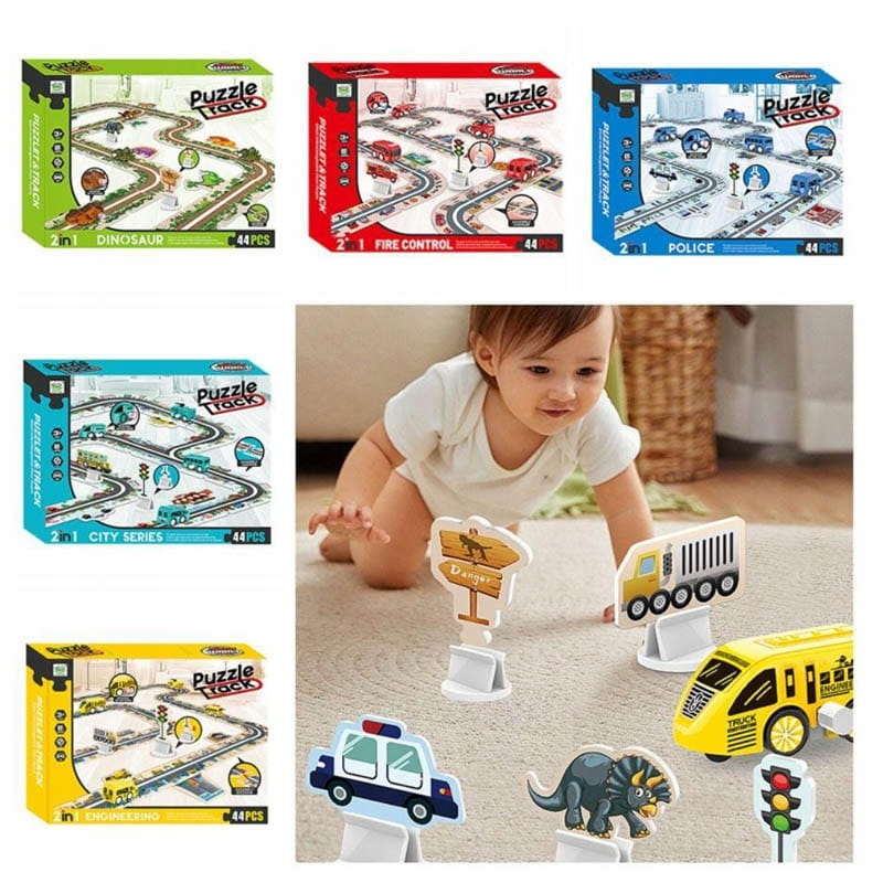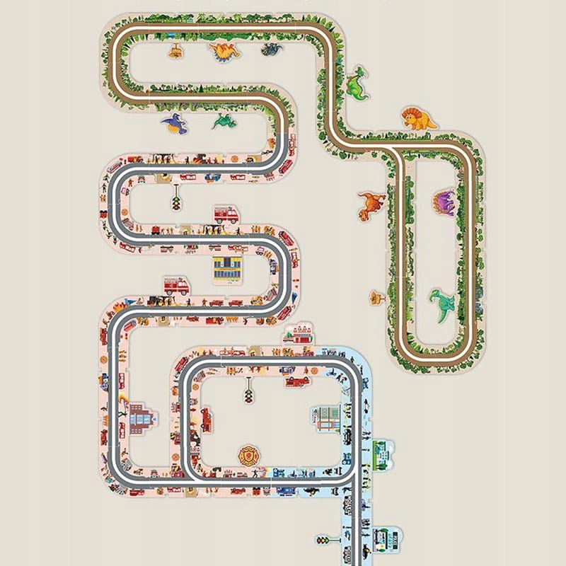 - дорога - трек для авто у вигляді пазла - невеликий виріз назовні дозволяє вільний проїзд іграшкової машинки. Пазли можна складати як завгодно, будуючи таким чином різноманітні маршрути. Наша пропозиція включає 5 моделей дорожніх головоломок (Динозаври, Поліція, Пожежна, Місто, Допомога на дорозі), завдяки яким ви можете побудувати трасу довжиною понад 5 метрів.