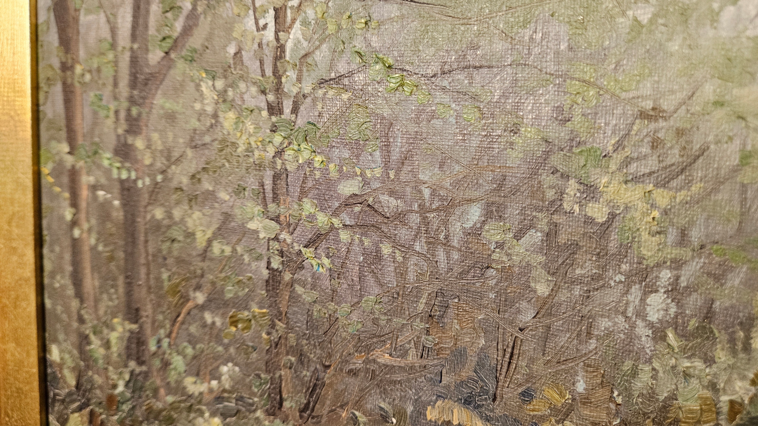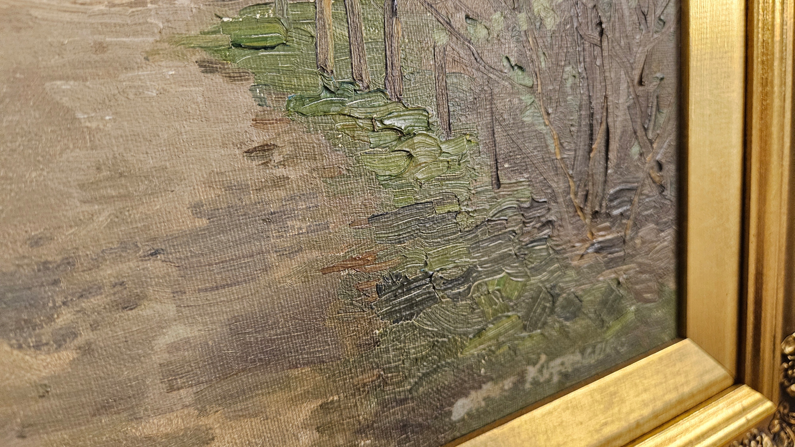 Предметом аукціону є оригінальна атмосферна картина маслом із зображенням лісової дороги, що веде вглиб тихого ландшафту. Композиція витримана в приглушених природних тонах, що створює враження тиші та гармонії з природою. Класичний пейзажний живопис ідеально підходить для традиційних і сільських інтер'єрів. Картина в дуже хорошому стані, без дефектів.