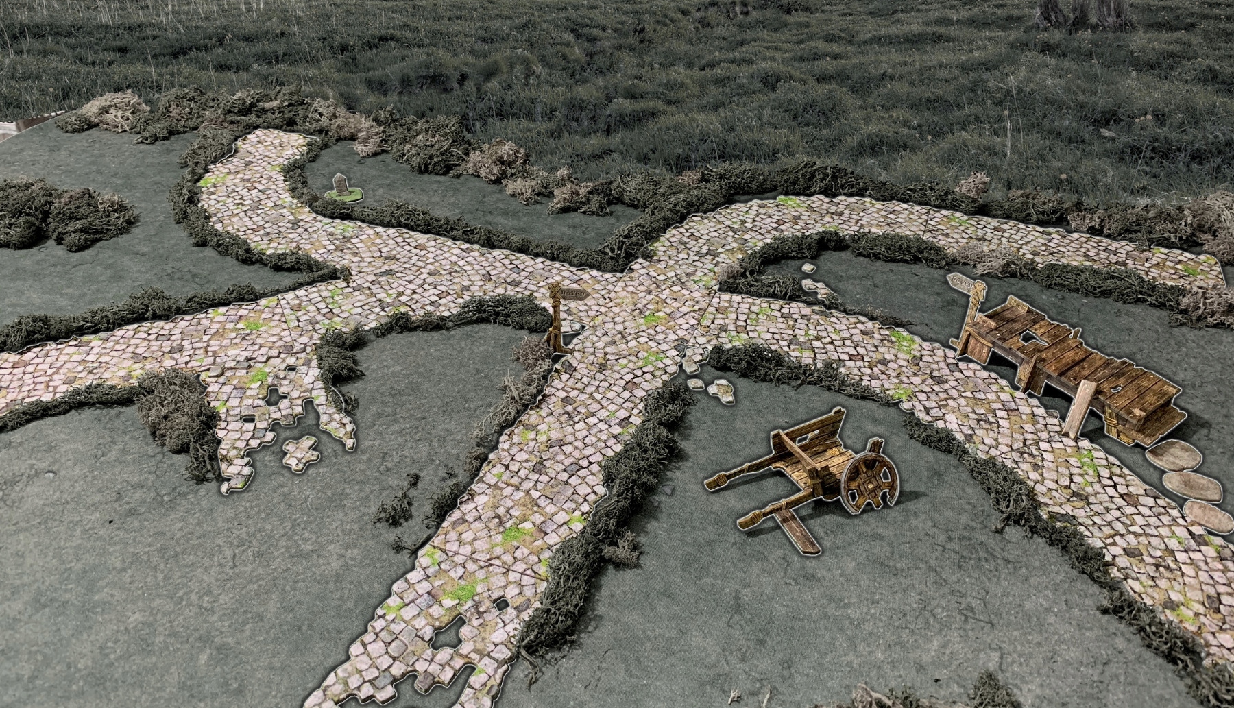 Цей набір доповнить ваш ігровий стіл бруківкою або річкою, що тече. Кожна двостороння секція має довжину приблизно 8 дюймів/20 см, а повний пакет має довжину майже до 6 футів/180 см! У набір входять різні перехрестя, а також покажчики та інша розрізнена місцевість, щоб додати вашій дошці ефект занурення. Компоненти сумісні з рештою асортименту Battle Systems Fantasy.