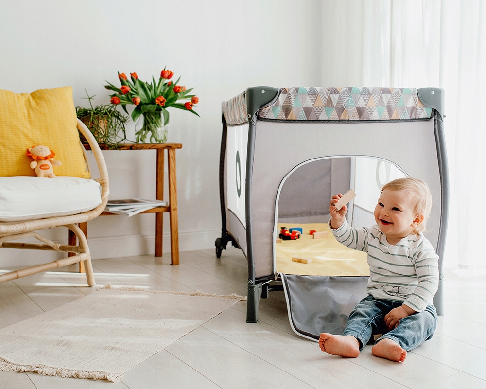 Конструкція захищає манеж від випадкового складання, що значно підвищує безпеку дитини. Це рішення особливо важливо, коли дитина стоїть або стрибає.