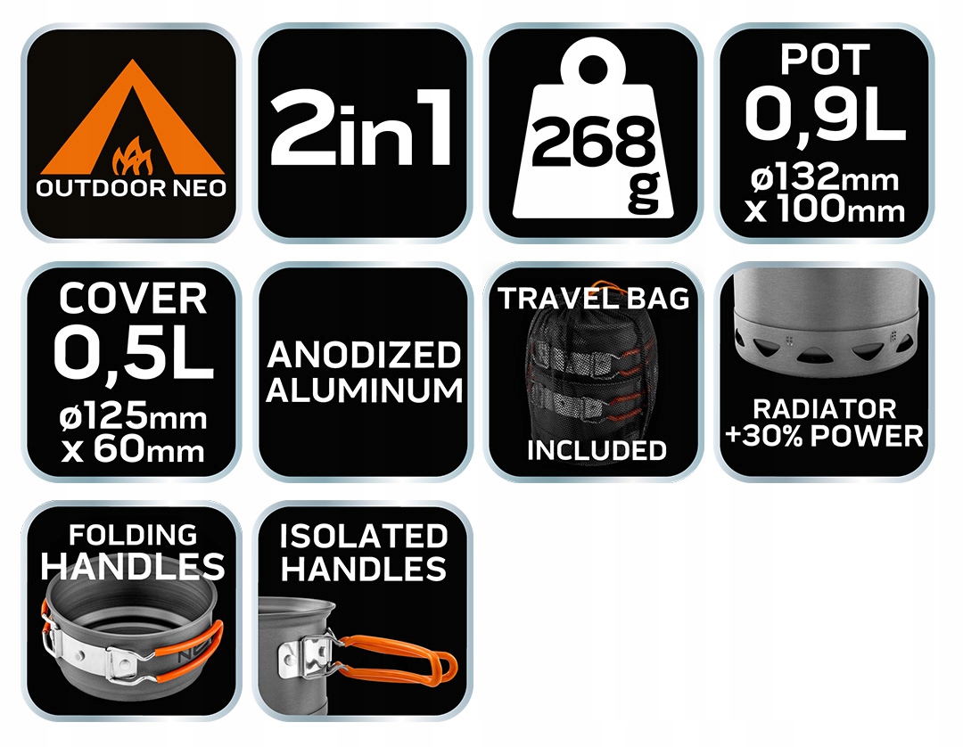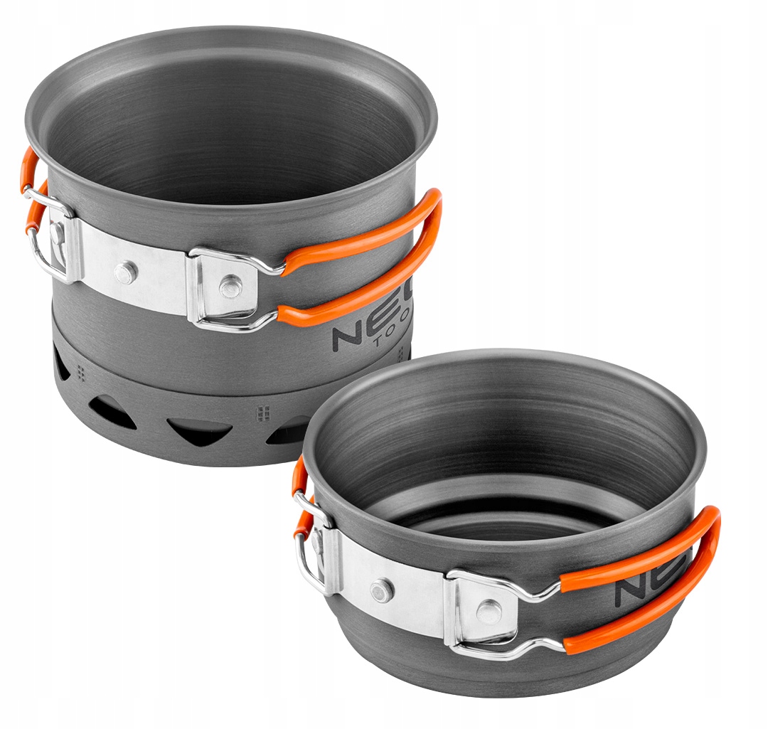 Набір каструль 2 в 1 з радіатором 63-144 NEO включає каструлю з радіатором, який захищає від вітру і збільшує діапазон роботи каструлі на 30%, і практичну сковорідку. Ємність каструлі 0,9 л, висота 100 мм, діаметр 132 мм. Ємність каструлі 0,5 л, висота 125 мм, діаметр 60 мм. Елементи виготовлені з анодованого алюмінію з високою міцністю та малою вагою. Вага всього набору становить всього 268 г, оснащені складними ізольованими ручками. Вони також мають дійсний сертифікат LFGB про контакт з харчовими продуктами. Це продукт, який ідеально підходить для поїздок за місто та кемпінгу. Пропонується з практичною дорожньою сумкою.