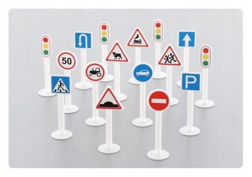 Набір із 16 дорожніх знаків неодмінно урізноманітнює розваги з машинками для кожного маленького водія, а також спонукає його до вивчення правил дорожнього руху. Стійкі барвисті знаки відображають справжні знаки.