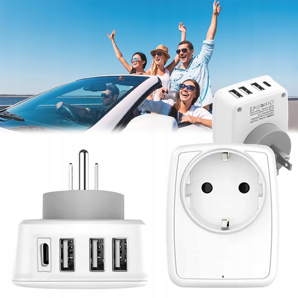 1 x 1 штекерний адаптер ЄС-США + 1 Type-C + 3 USB-A.