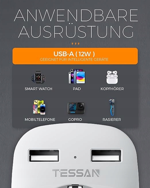 Дорожній адаптер TESSAN 3 в 1 - 1AC+2USB Type G (UK)