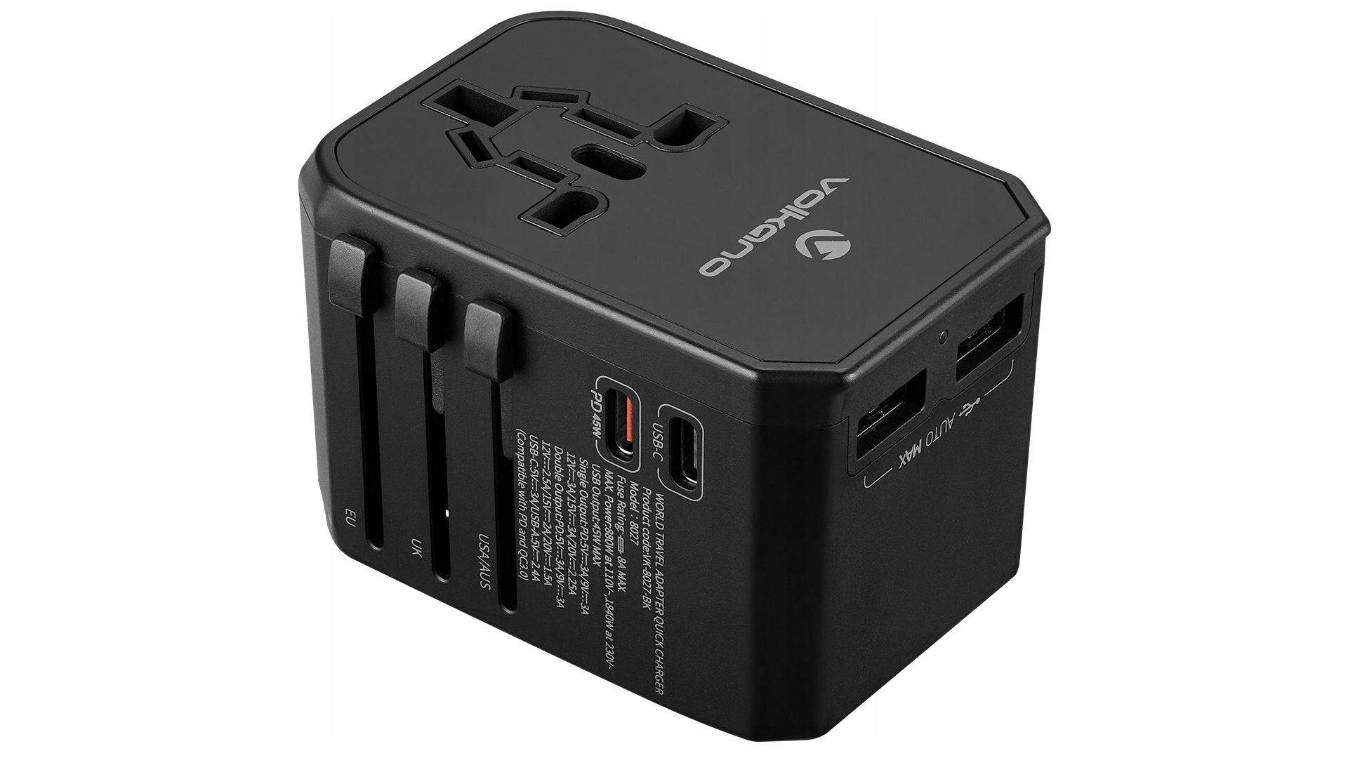 Цей універсальний дорожній адаптер дозволяє заряджати до чотирьох пристроїв одночасно завдяки 2 портам USB-C (45 Вт і 20 Вт) і 2 портам USB-A (12 Вт). Він підтримує технологію Power Delivery (PD) і Quick Charge 3.0, яка забезпечує швидку та ефективну зарядку смартфонів, планшетів, ноутбуків та інших пристроїв. Вбудований світлодіодний індикатор інформує про роботу пристрою, а інтелектуальна система керування енергією запобігає перегріву та перевантаженню, забезпечуючи повну безпеку зарядки.