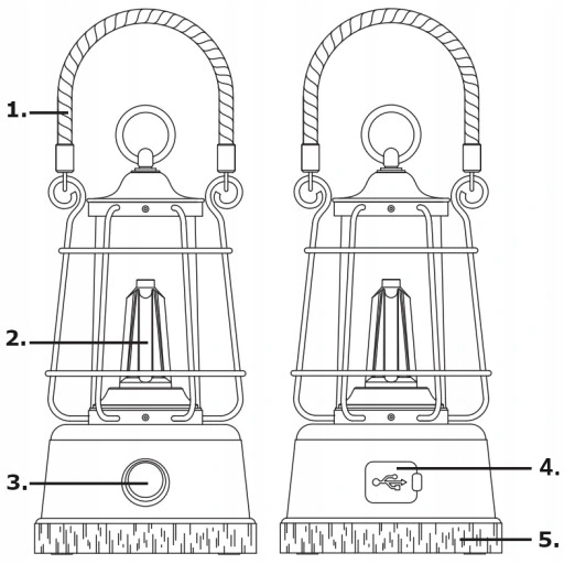 - Вбудований блок живлення кемпінгової лампи дозволяє зручно заряджати пристрої, оснащені роз’ємом USB, наприклад смартфони - ідеальне рішення під час відпустки в кемпінгу