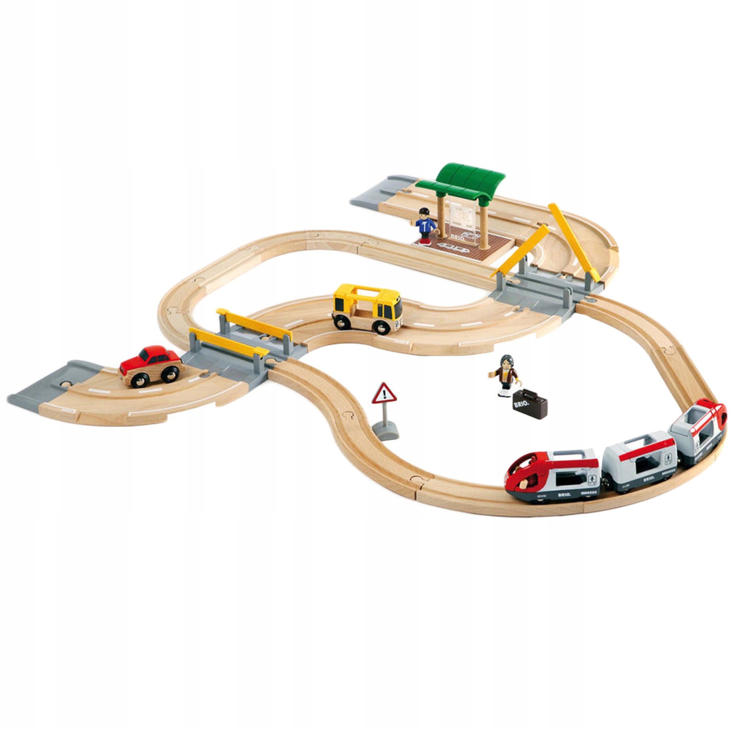 Пасажирський поїзд їде! Двовагонний поїзд готовий перевозити пасажирів дивовижним світом BRIO. Подивіться у вікно і побачите, як машини зупиняються на залізничному переїзді. На щастя, потяг прибуває вчасно, деяким пасажирам ще доводиться пересідати на автобус!