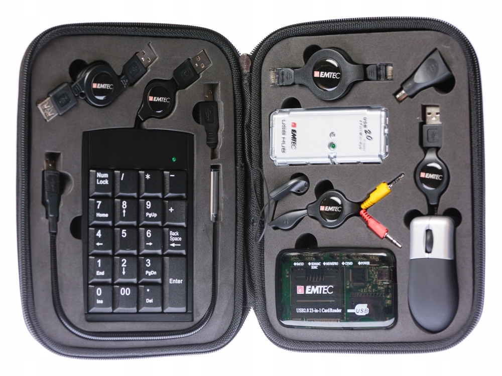 Дорожній набір Emtec — ідеальне рішення для тих, хто часто подорожує зі своїм ноутбуком. У набір входять всі необхідні елементи, які можуть полегшити роботу в найдальшому куточку світу. Набір упакований в практичний і естетичний футляр.