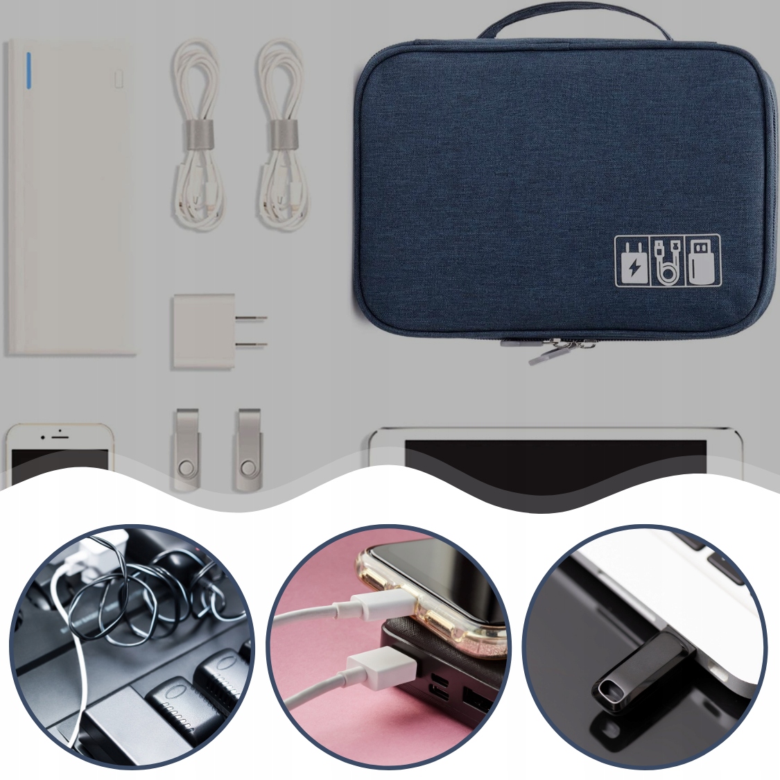 Зберігання та організаціярізних електронних аксесуарів, таких як кабелі, навушники, блоки живлення, зарядні пристрої, карти пам’яті, накопичувачі, телефони та інші електронні аксесуари.
