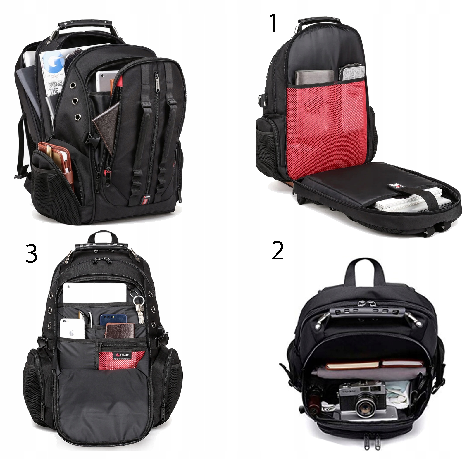 Заднє відділення можна відкривати та розкладати, як валізу, що забезпечує легкий доступ до вмісту. У середньому відділенні рюкзака є невелика кишеня з 3 різними портами, що виходять назовні, і кабель із 3 кінцями.