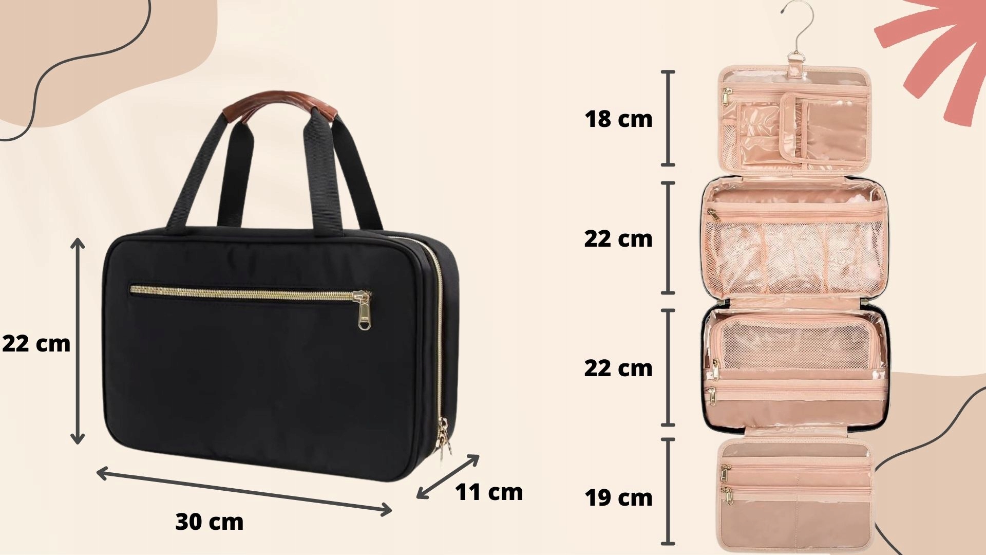 - ✅У третьому відділенні ви знайдете велику кишеню на гумках, куди можна покласти великі речі, як-от шампунь, лак для волосся, маленьку сушарку, кишеню на блискавці, щоб нічого не було випасти
