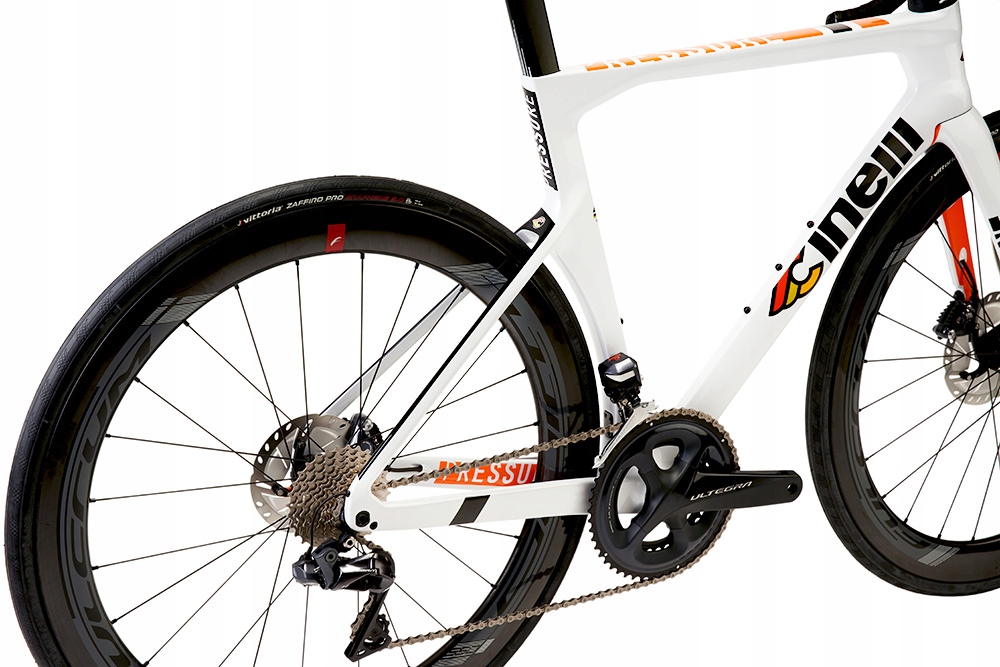 Нещодавно розроблена рама Cinelli для аерогонок включає в себе все можливе: спеціальну підсідельну трубу, повністю інтегроване кермо FSA Vision Metron 5D ACR у спеціальному фарбуванні, інтегровану гарнітуру, кабіну та вилка, що забезпечує найчистішу внутрішню прокладку кабелю та найшвидшу гоночну геометрію. Знижений задній трикутник забезпечує максимальну аеродинаміку та більшу загальну жорсткість рами. Впевненість у керуванні та контролі над велосипедом забезпечують дискові гальма на жорсткій наскрізній осі.