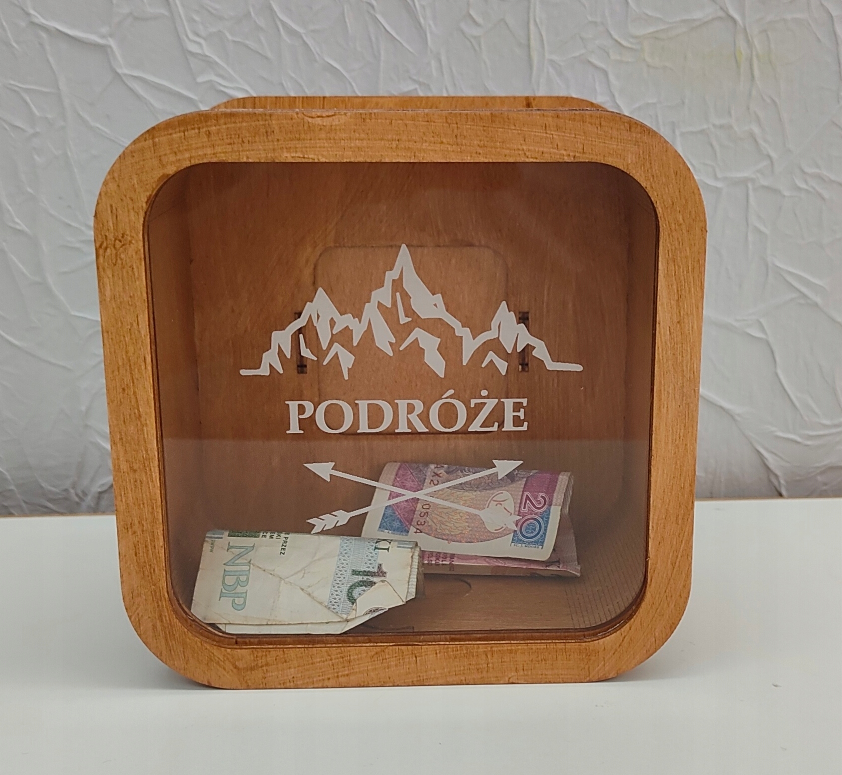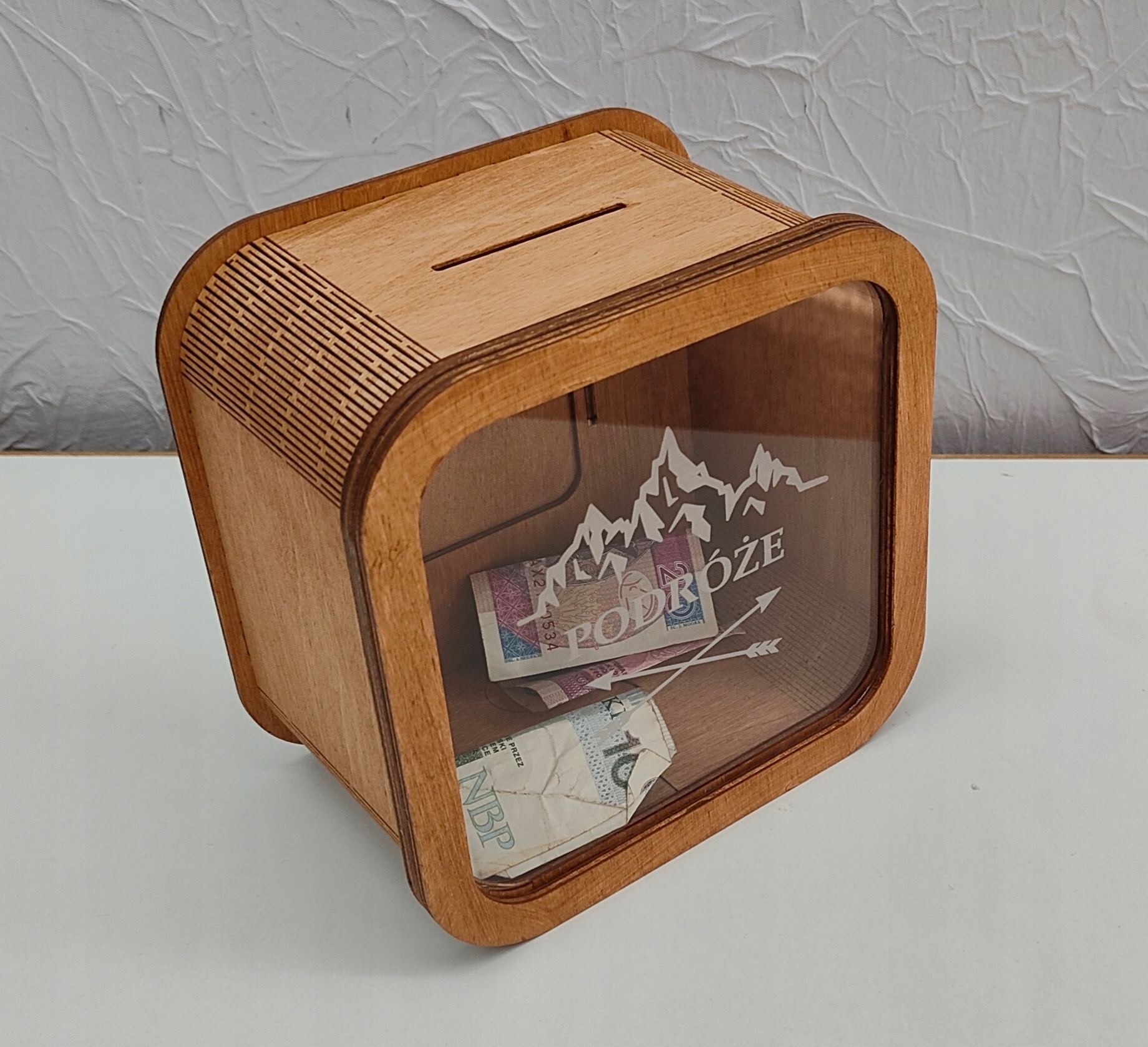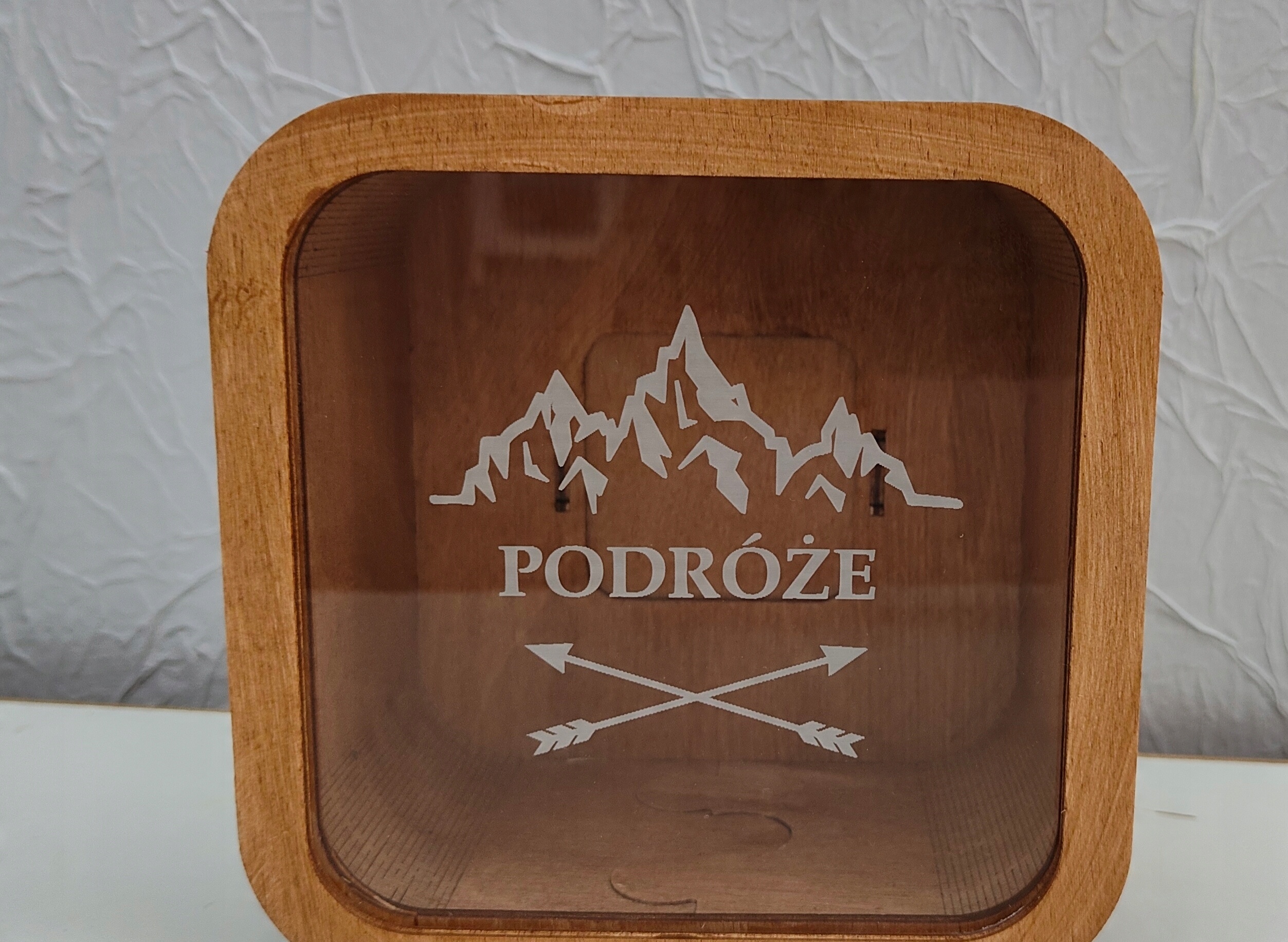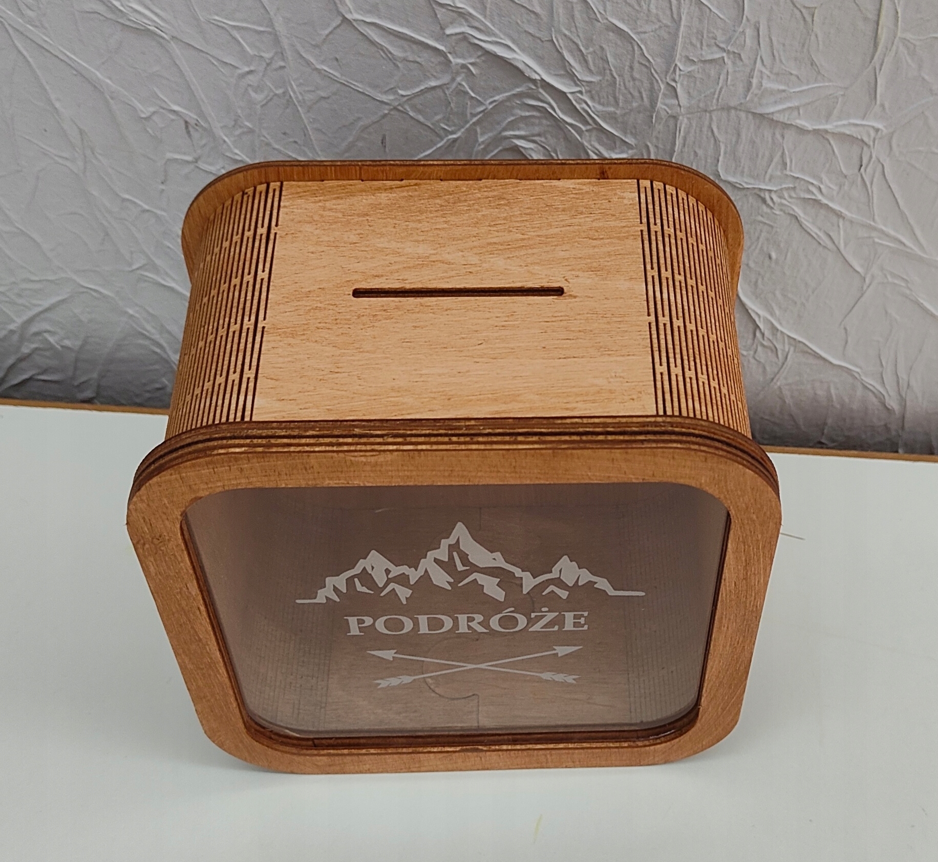 Скарбничка виготовлена з фанери товщиною 3мм з просоченням каштанового кольору. Крім того, він був збагачений литим оргсклом 3 мм. Викарбувано напис, гори. Особливість литого оргскла полягає в тому, що гравірування на ньому виходить майже білим і виглядає так, ніби воно намальоване.