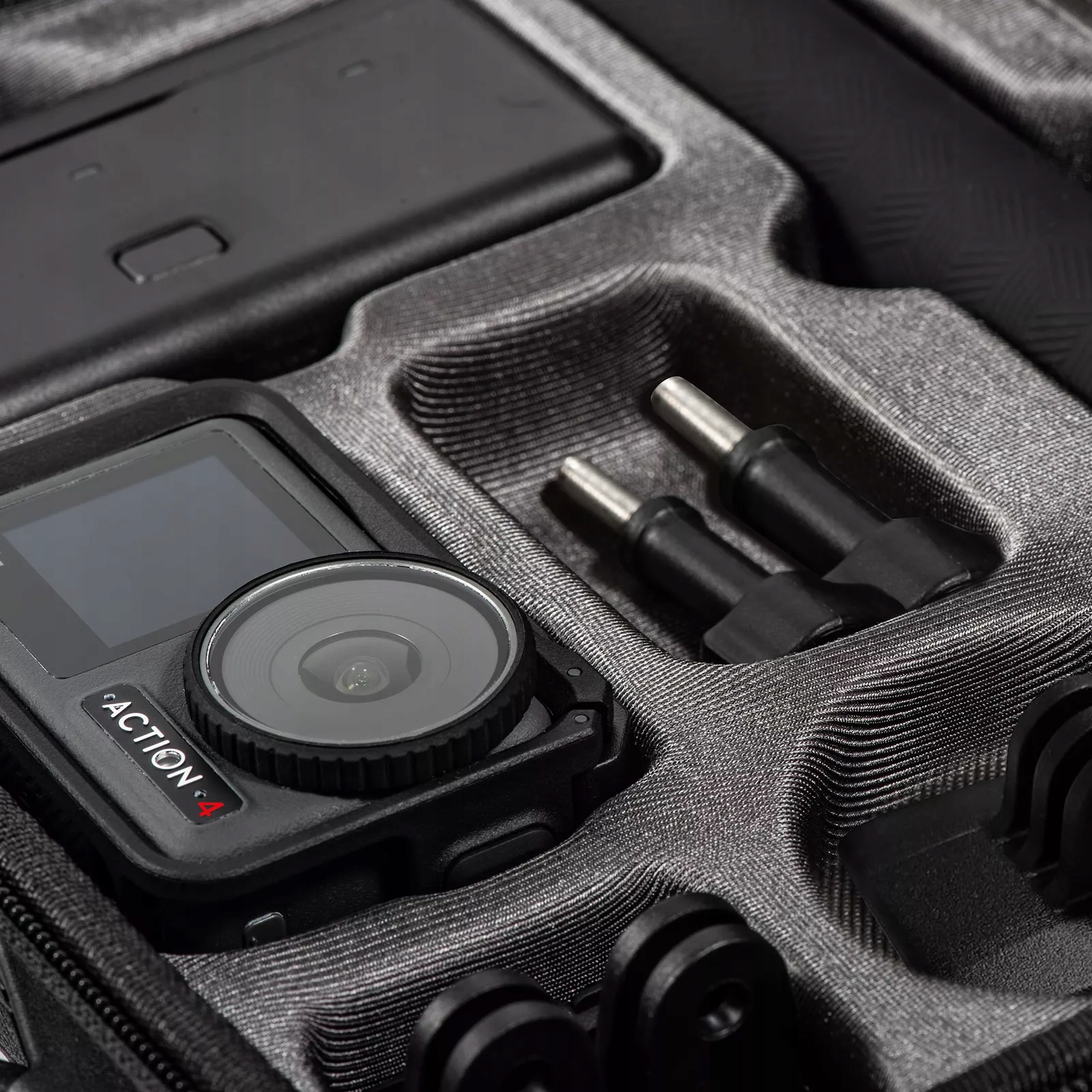 💡💡Призначений для спортивної камери ACTION3/4, точного формування, невеликого розміру, але великої місткості, може зберігати універсальний набір, такий як зберігання: подовжувач + акумулятор + захисна рама + швидкознімний адаптер + коробка для зберігання акумулятора + плоска з'єднувальна основа та інші дрібні аксесуари;