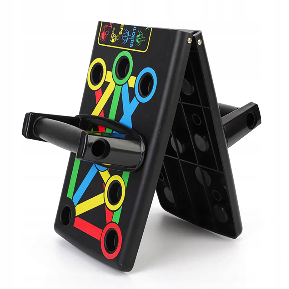 Багатофункціональна дошка для віджимань - чудова альтернатива традиційним віджиманням. Дошка з кольоровими лініями містить опори, які полегшують згинання рук перед опорою. Його використання дозволяє тренувати практично всю верхню частину тіла. Змінюючи кут нахилу опор, ви можете тренувати окремі частини тіла.
