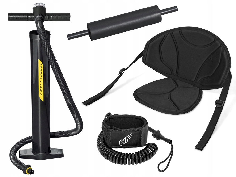Дошка для серфінгу Bestway має зручне сидіння зі спинкою. У набір також входить міцне весло, ручний насос, поводок, рюкзак, ласти та ремонтний набір.
