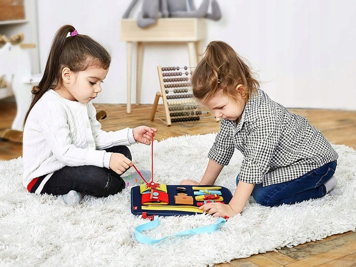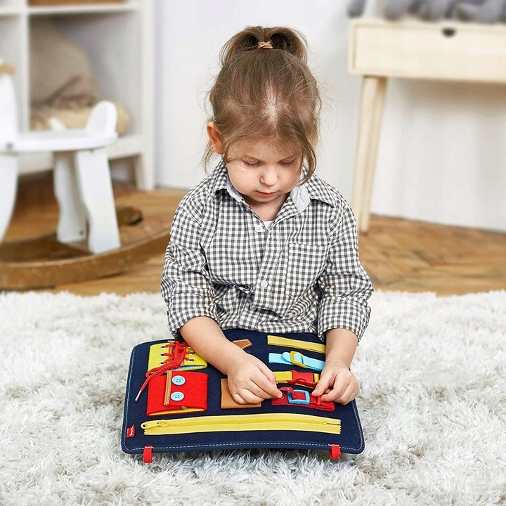 Дошки використовують методику Монтесоріа, вони розважають та навчають дітей, використовуючи повсякденні матеріали - замки, ключі, шнурки, гачки тощо.