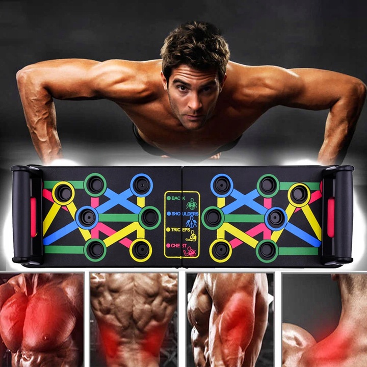 Багатофункціональна дошка для віджимань - чудова альтернатива традиційним віджиманням. Дошка з кольоровими лініями містить опори, які полегшують згинання рук перед опорою. Його використання дозволяє тренувати практично всю верхню частину тіла. Змінюючи кут нахилу опор, ви можете тренувати окремі частини тіла.