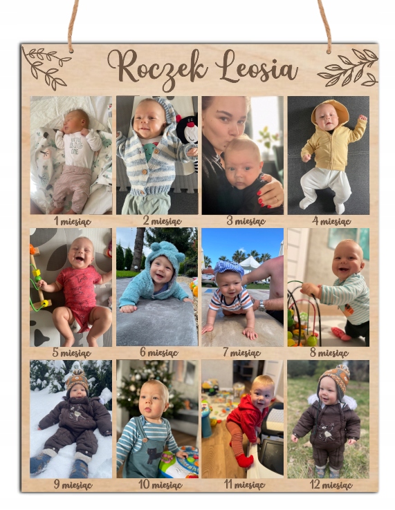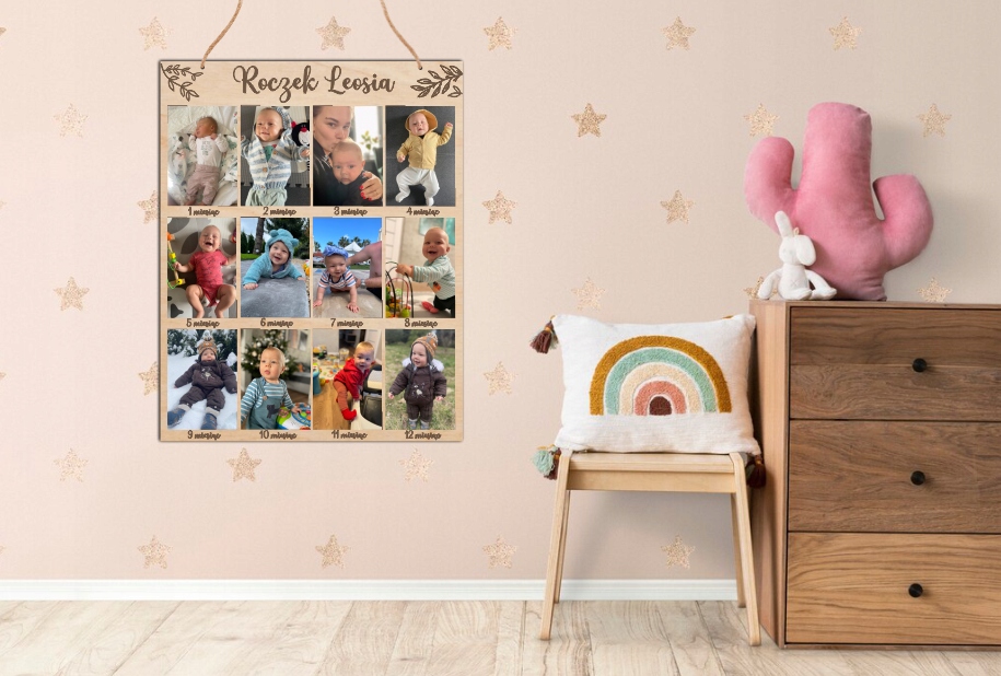 Персоналізована дошка для фотографій з кожного місяця першого року дитини. Дошка чудово підійде як прикраса під час святкування дня народження, а після року стане чарівною прикрасою кімнати малюка, а значить сувеніром на довгі роки. У комплект входить шнурок для підвішування. Дошка ретельно відполірована.