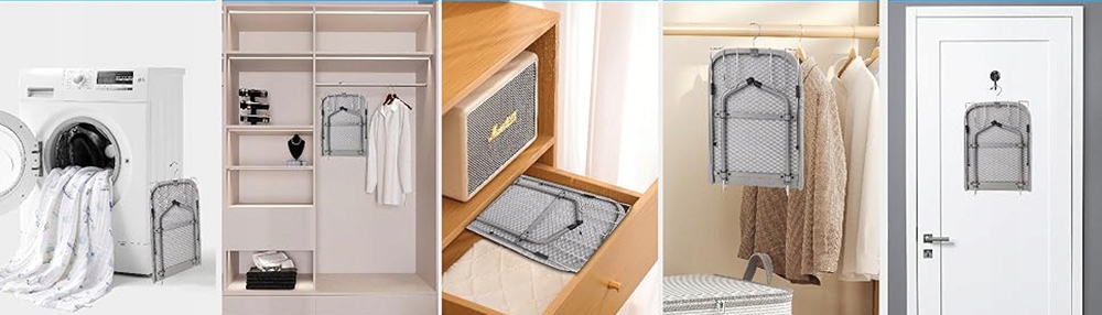 Посилена металева сітка швидко розподіляє тепло, забезпечуючи ефективне прасування. Регульовані нековзкі ніжки захищають підлогу та гарантують стійкість, а вентильована конструкція запобігає накопиченню тепла.