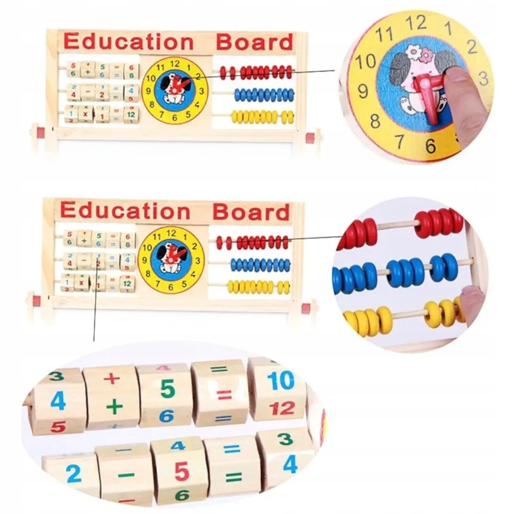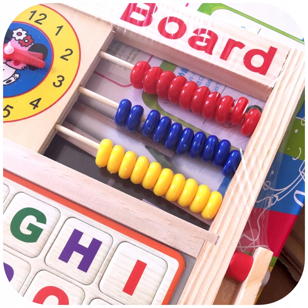 Дошка поєднує багато корисних функцій в одному предметі. Її можна використовувати як крейдову дошку, на якій дитина вчиться писати. На магнітній дошці можна розмістити магніти з буквами та цифрами, що входять до комплекту. Він/вона може писати або малювати на дошці сухого стирання фломастером. Абакдопоможе вам розвинути ваші математичні здібності, а годинникпокаже, як працює час і як користуватися годинником.