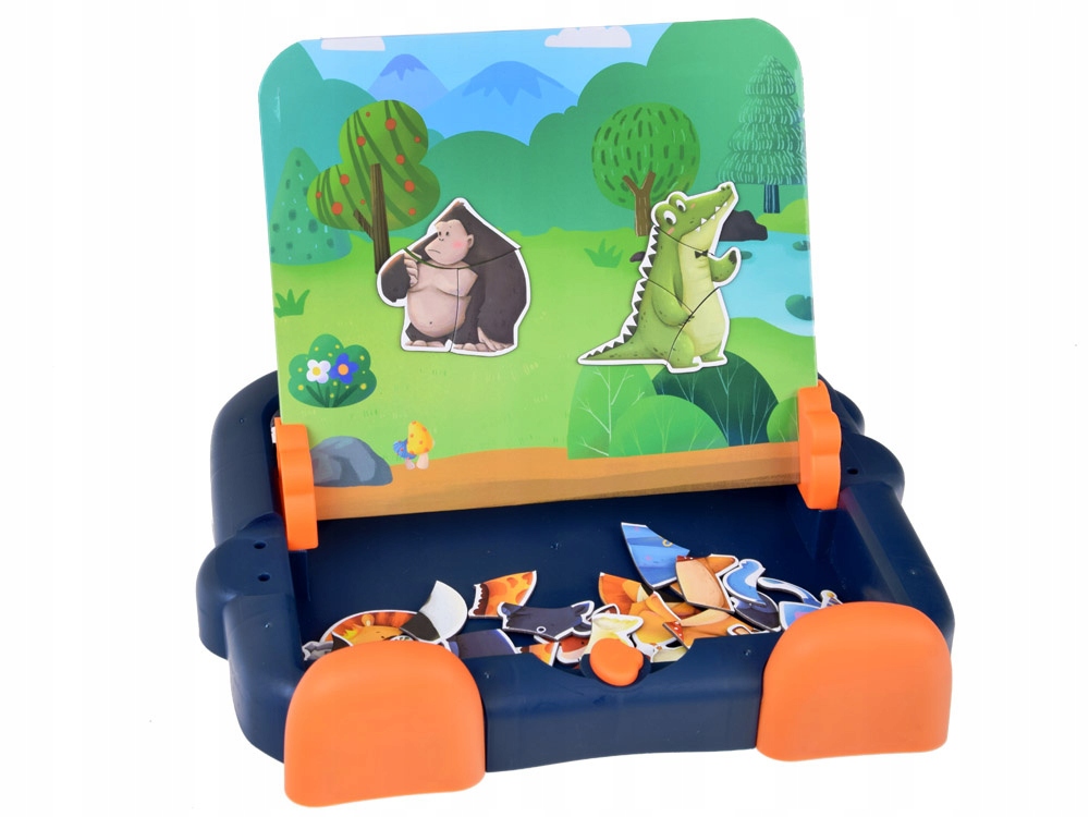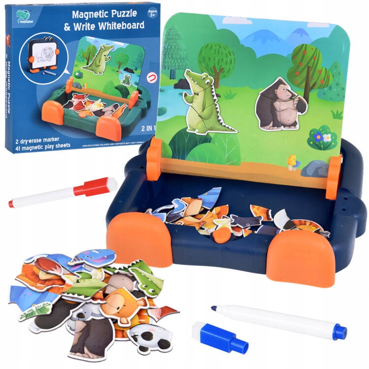 - Інноваційна магнітна дошка 2-в-1, яка надихає дітей на творчі ігри! У набір входить 41 магнітний пазл із зображенням милих тварин, а також двостороння дошка, на яку їх можна копіювати. Дитина може розвивати дрібну моторику, творчі здібності та уяву, практикуючи координацію рук і очей і графомоторику. У набір входять ручки для малювання, симпатична пластикова упаковка з набором наклейок і зручні підставки для дошок, що нагадують лапки і ніжки. Дошка ідеальна для того, щоб взяти з собою в подорож, на прогулянку або в гості до бабусі. Дивіться творчий набір в магазині «Джокомісіада» та здивуйте свою дитину чудовим подарунком!