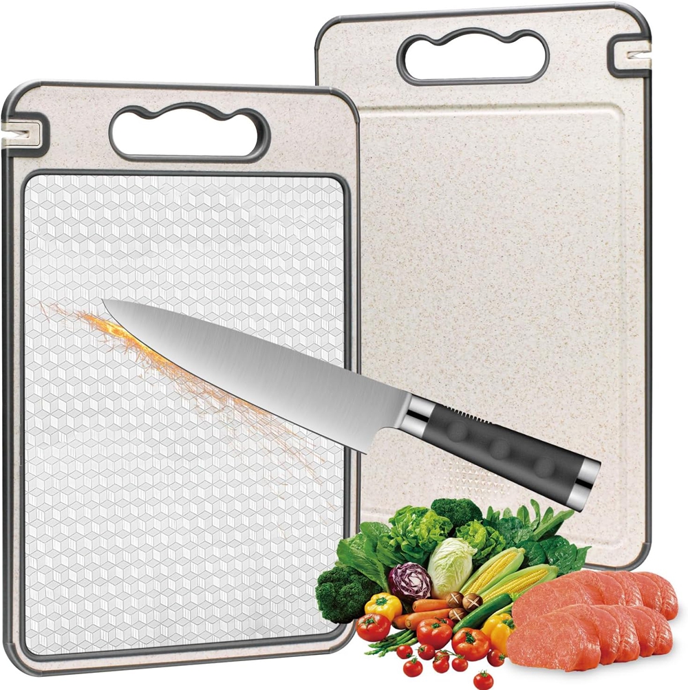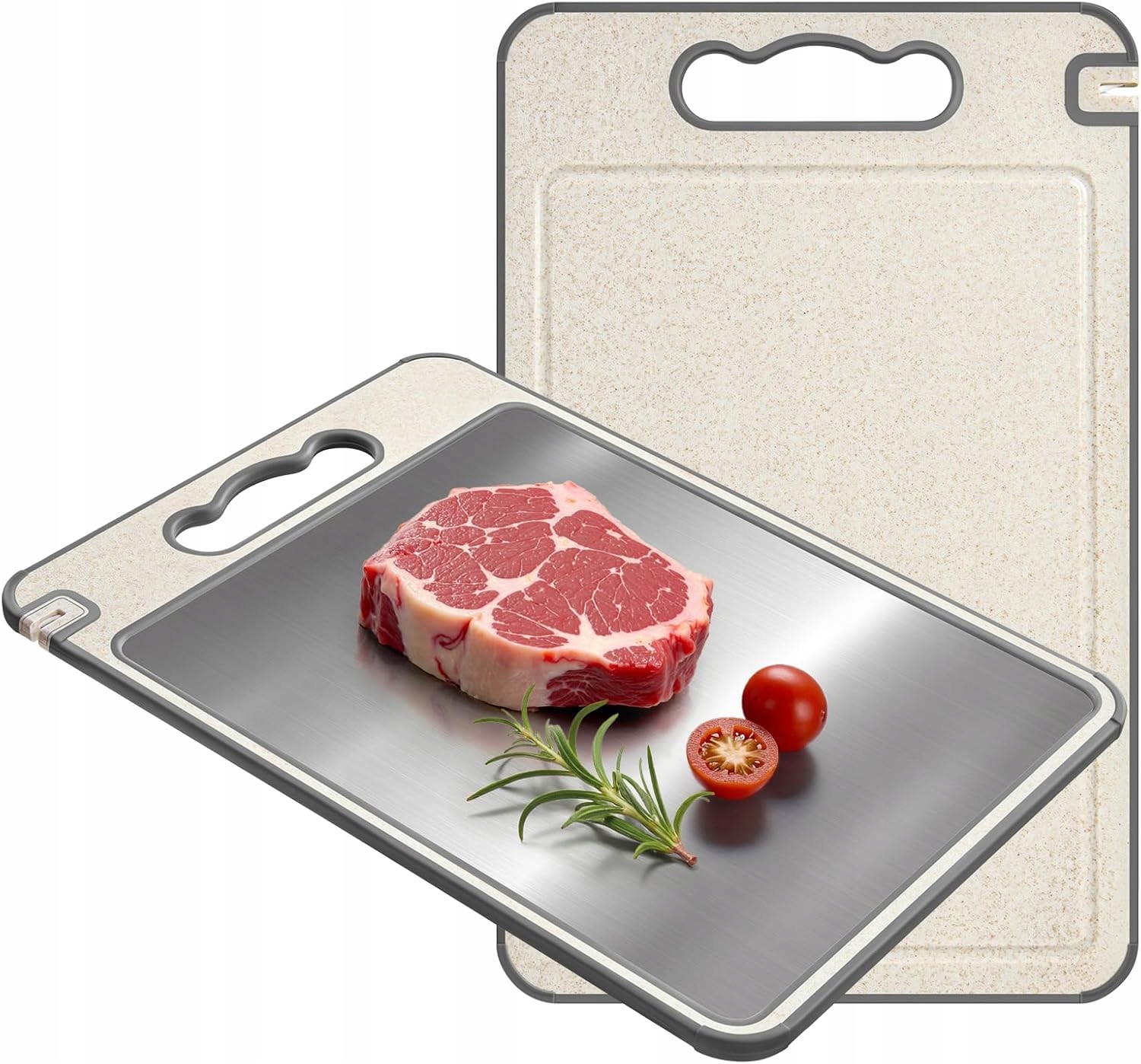 Ідеально. Одна сторона обробної дошки з нержавіючої сталі виготовлена з високоякісної нержавіючої сталі 304, придатної для сирого та вареного. м'ясо. Друга сторона виготовлена з високоякісного ПП пшеничного солом'яного матеріалу (без бісфенолу А), підходить для нарізання овочів і фруктів. Міцний і довговічний, стійкий до перехресного забруднення, здоровий і не має запаху.