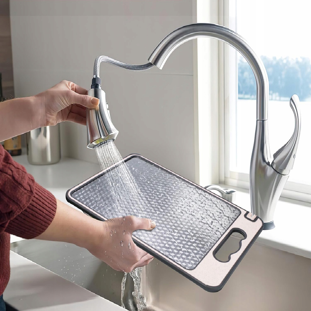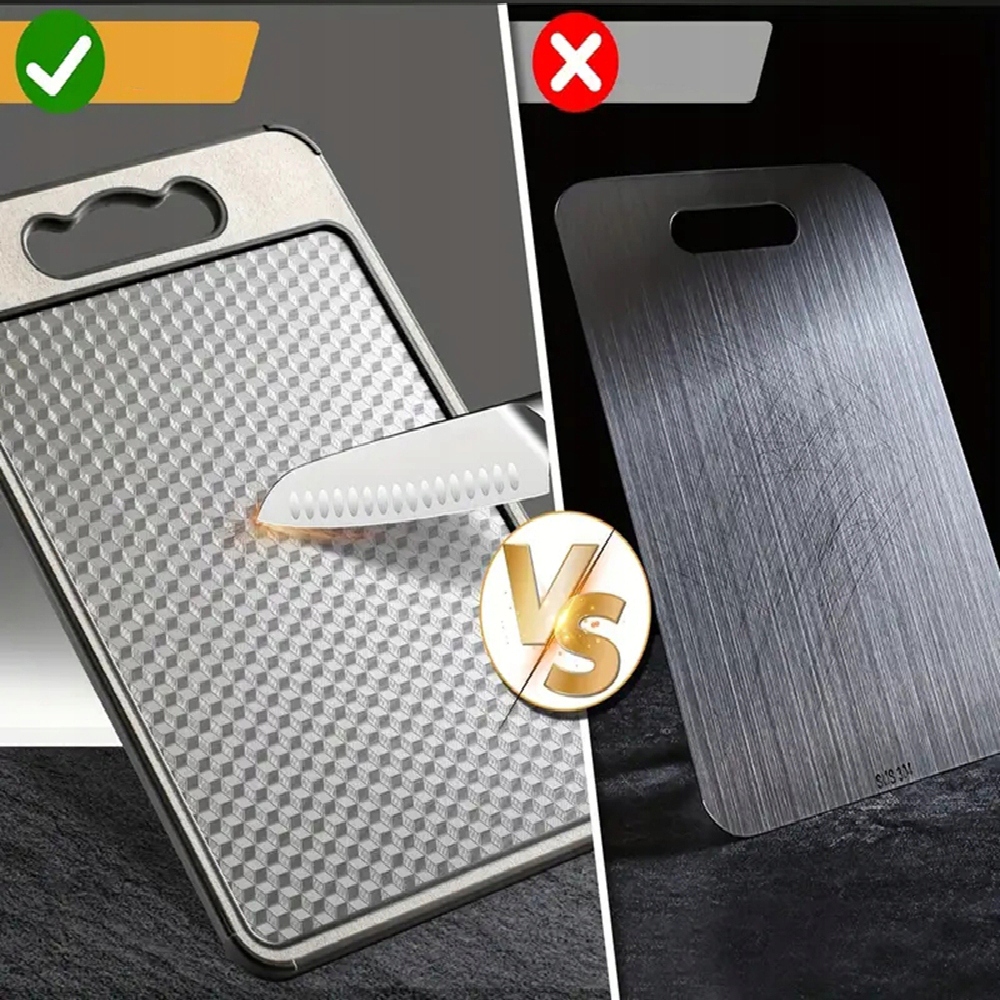 Двостороння обробна дошка з нержавіючої сталі важко прилипає до бруду, її можна сполоснути чистою водою або мити в посудомийній машині. На відміну від дерев’яних обробних дошок, які легко дряпаються та їх важко чистити, це чудова альтернатива пластиковим і дерев’яним обробним дошкам.