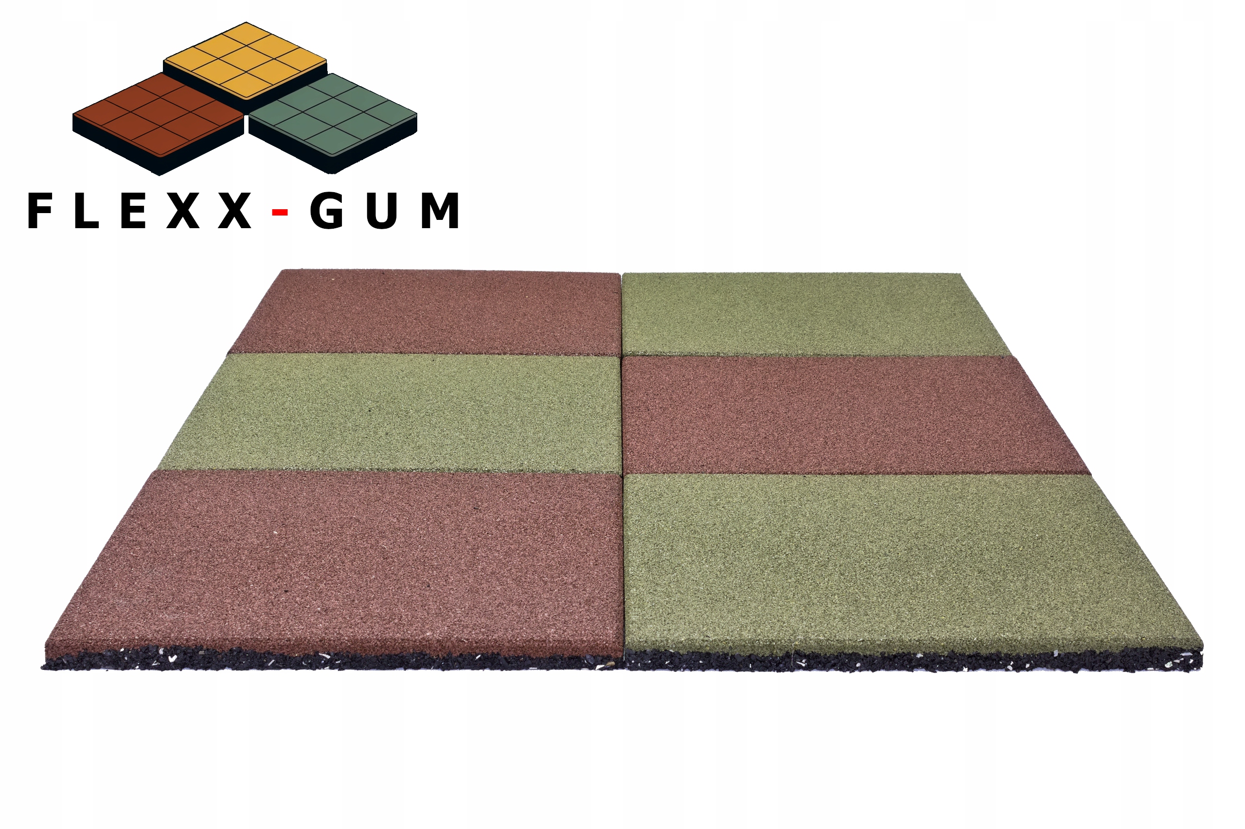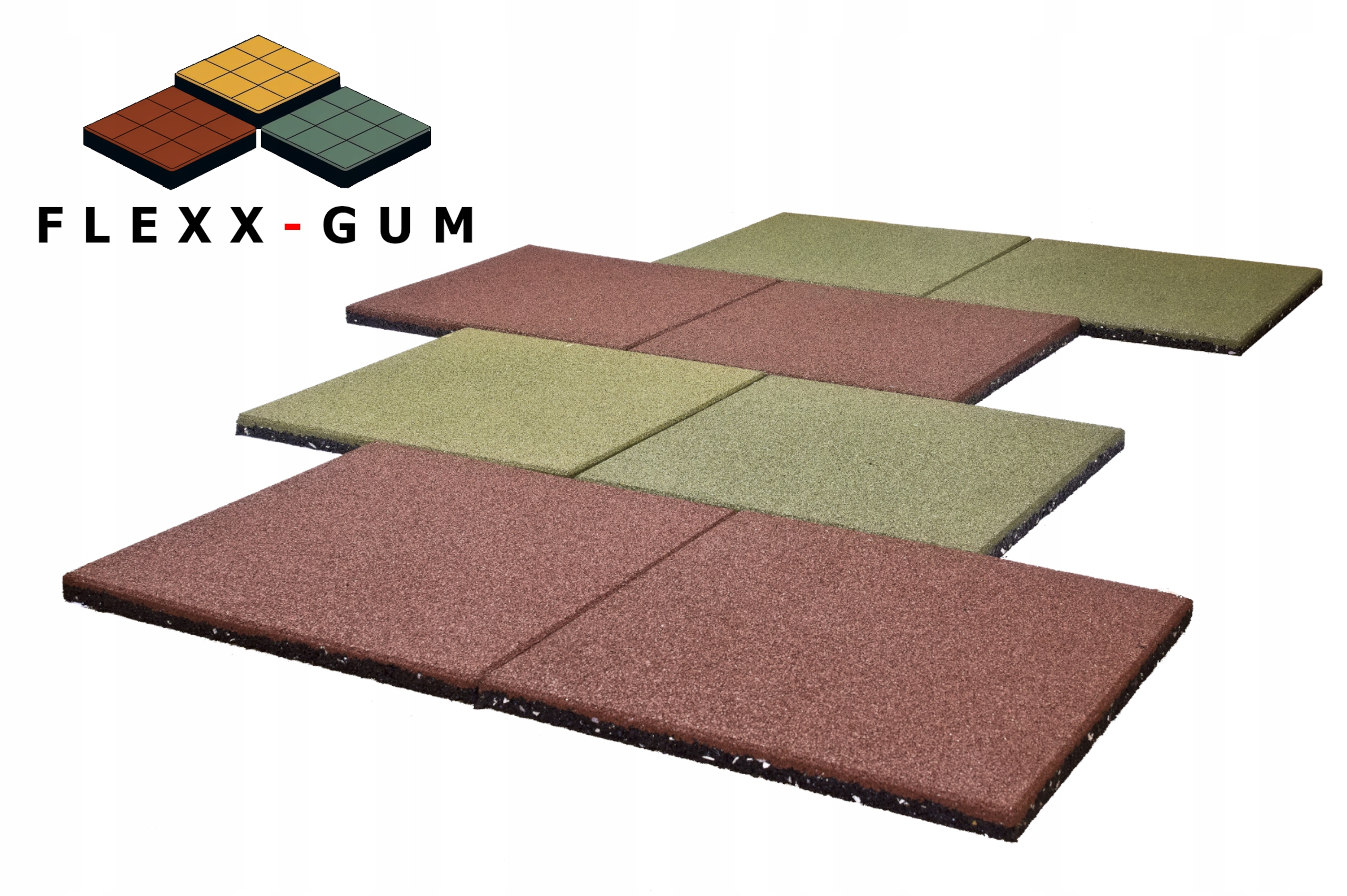 Гумові килимки SBR від Flexx-Gum доступні в зеленому, сірому, графітовому, червоному та чорному кольорах. Ця пропозиція поширюється на одну зелену плиту.