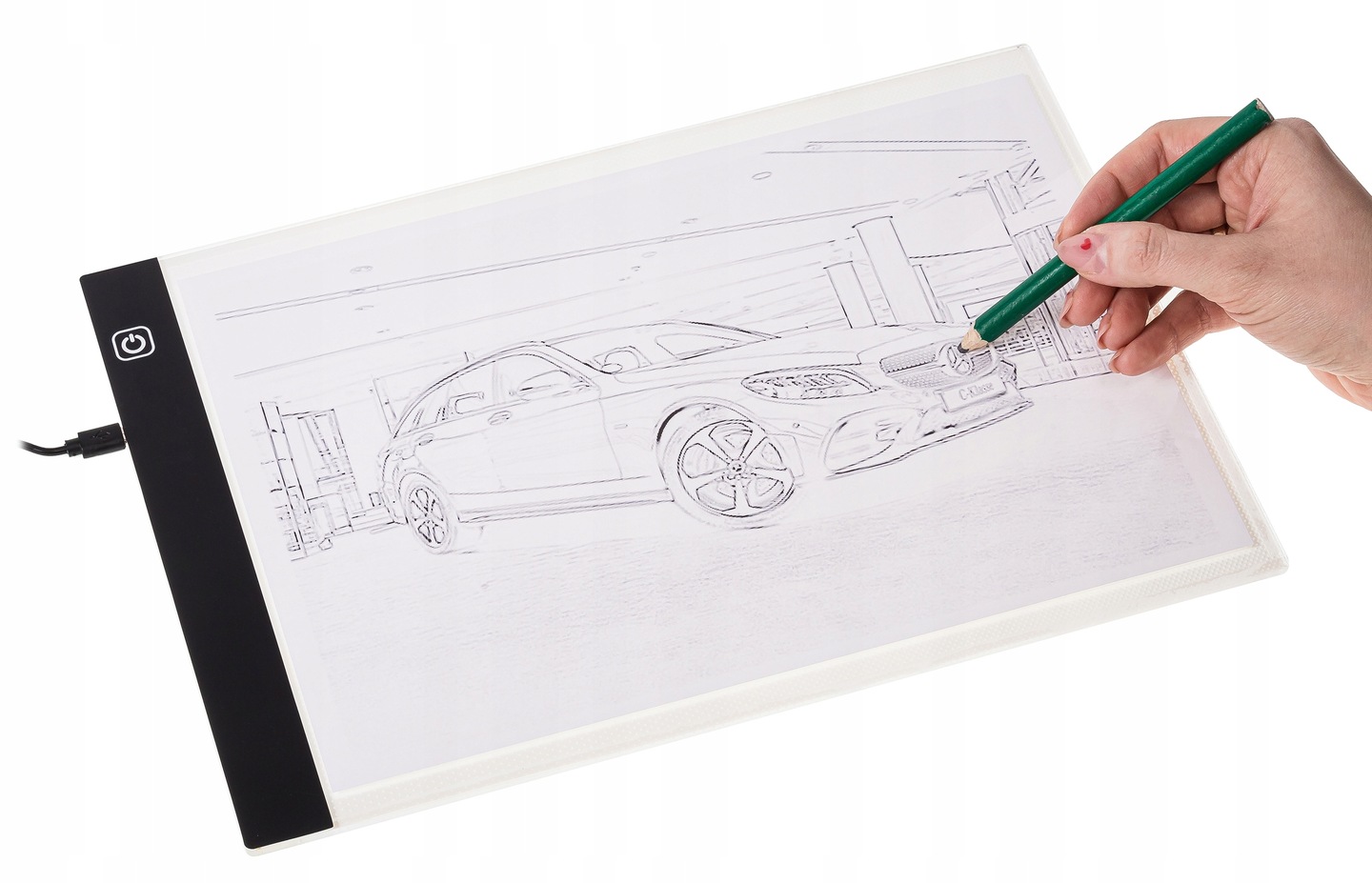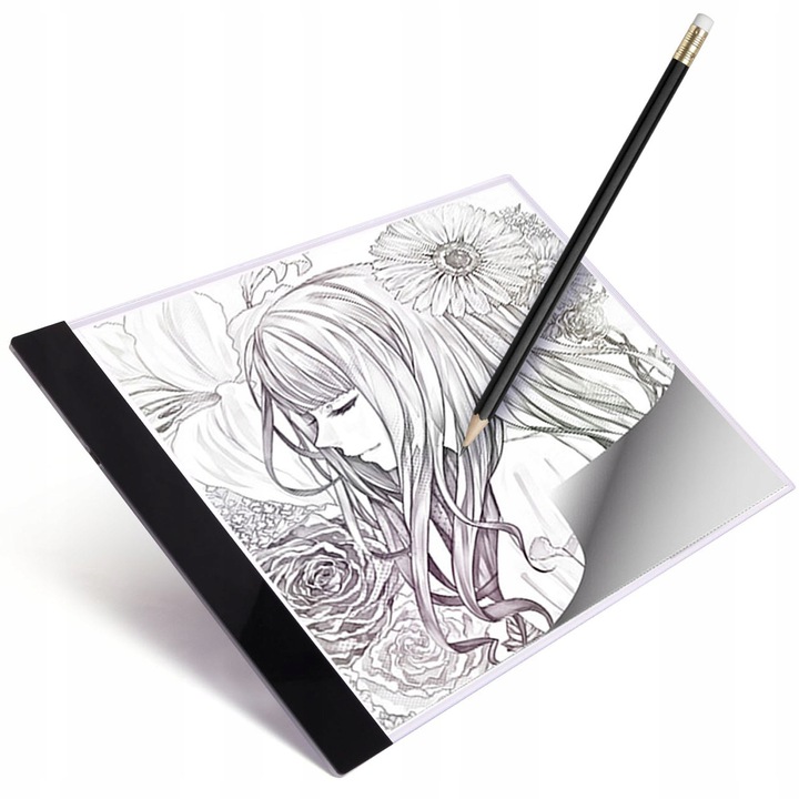 Професійна дошка для малювання з підсвічуванням, призначена для створення ескізів і малюнків на кальці та папері. Завдяки дуже хорошому світлодіодному підсвічуванню з інтенсивністю 300-350 лм аркуш із зображенням, яке ми хочемо нанести, буде переекспоновано на аркуші паперу. Рекомендується, щоб аркуш паперу, на якому ми наносимо малюнок, не перевищував 200 г/м2. Щоб покращити ефект, ви можете приглушити світло в кімнаті
