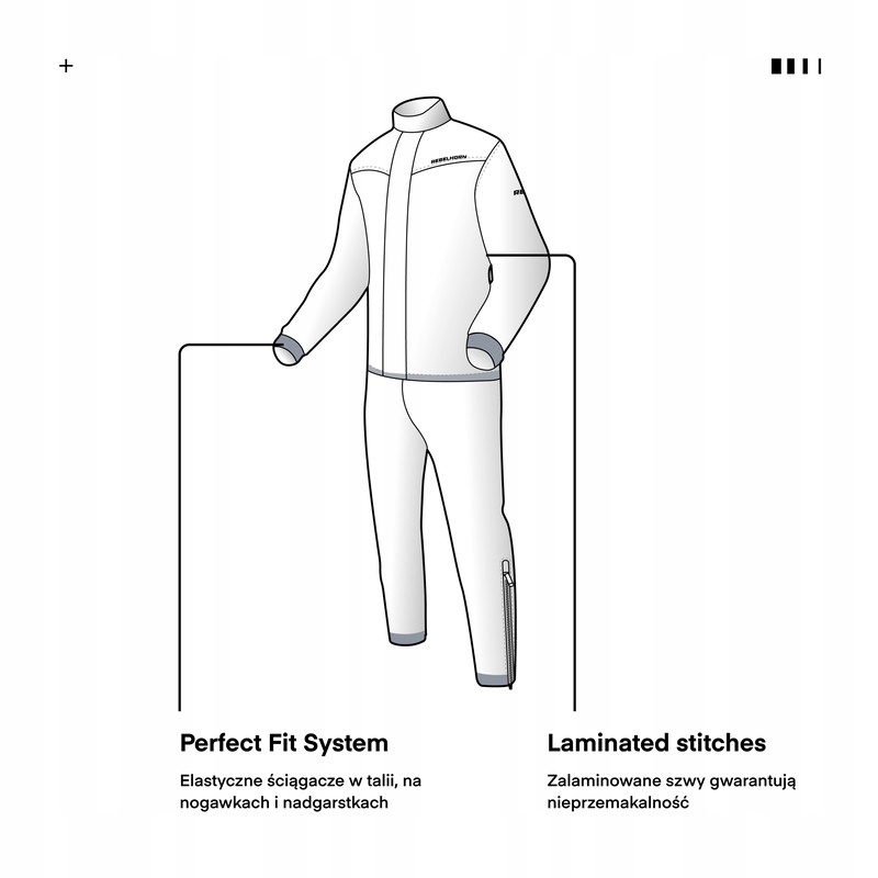 REBELHORN RAIN - це двокомпонентний дощовик з поліестеру. Для підвищення рівня ізоляції він має ламіновані шви для запобігання протіканню. Для підвищення безпеки на плечах використовуються світловідбиваючі вставки, що особливо актуально в моменти обмеженої видимості. Шнурки на ногах, зап’ястях і талії забезпечують зручну посадку.