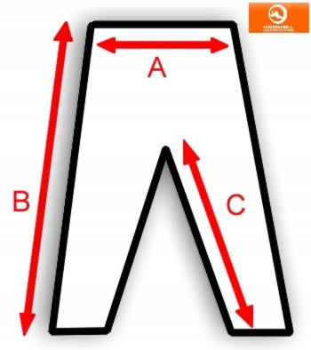 XXL) Розмір А / брюки вільного крою / - 46 см. , розмір А /після розтягування/ -59см. Розмір B – 114 см. Розмір C – 84 см.