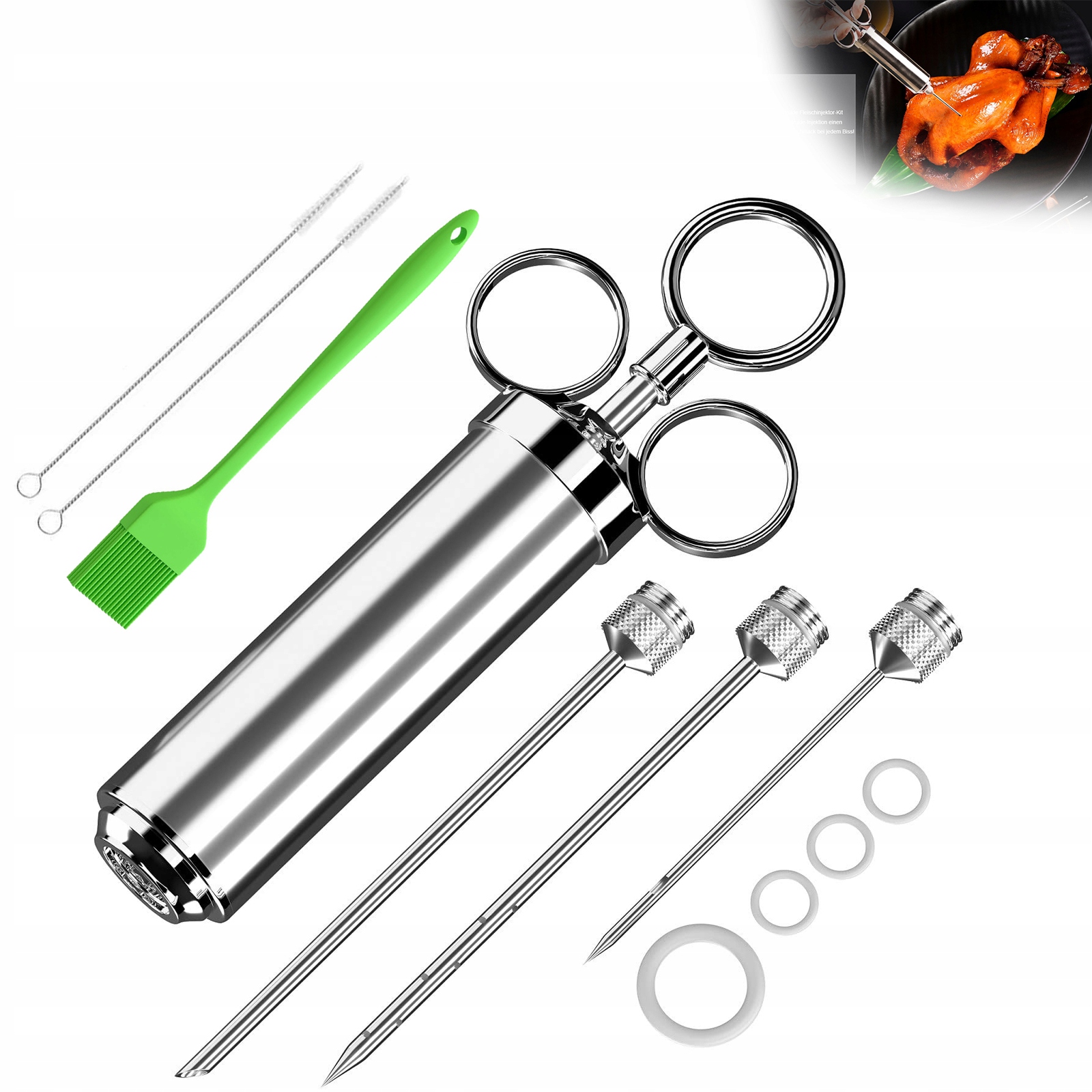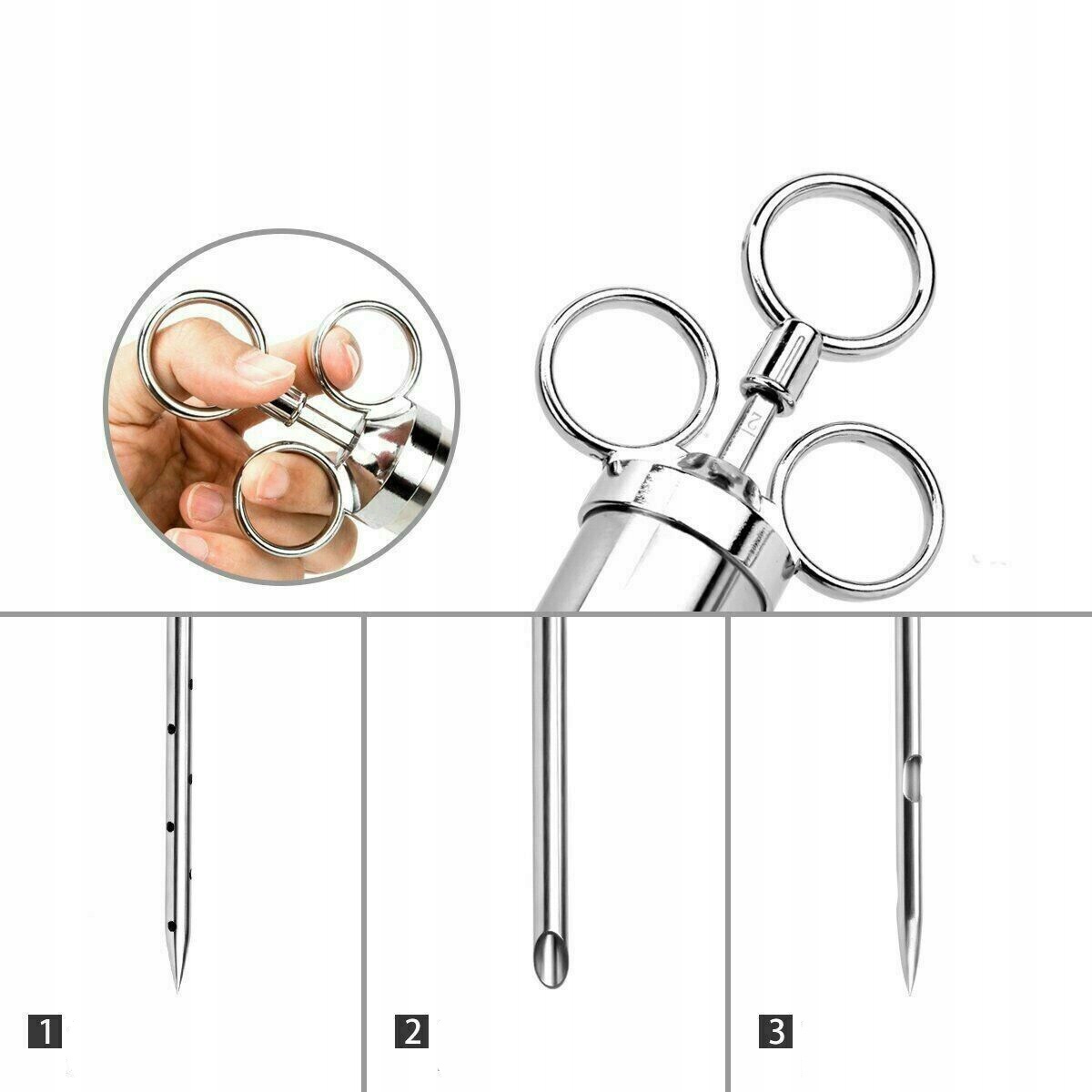 - The first needle with a wide outlet is ideal for applying marinades with large pieces of spices The needle with many holes at different heights guarantees even meat rectum