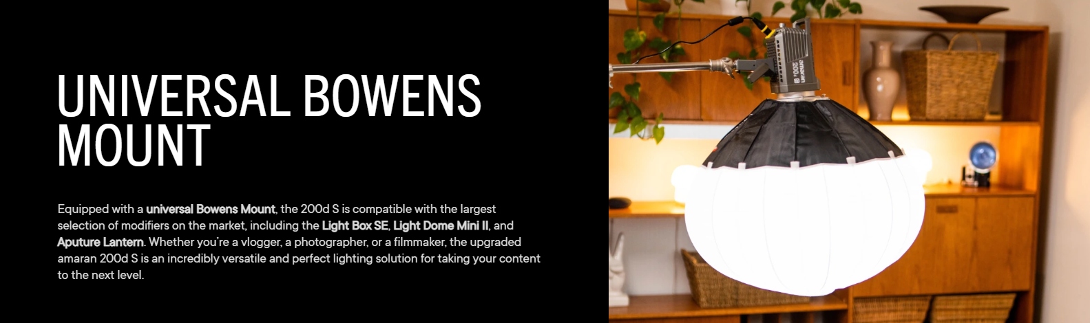 Представлена світлодіодна лампа підтримує популярний стандарт Bowens, який використовується для встановлення модифікаторів світла у світі та фотографій. Сотні аксесуарів, таких як ворота, чаша, софти, сітки або потоки чекають з'єднання з моделлю Amaran 100x.
