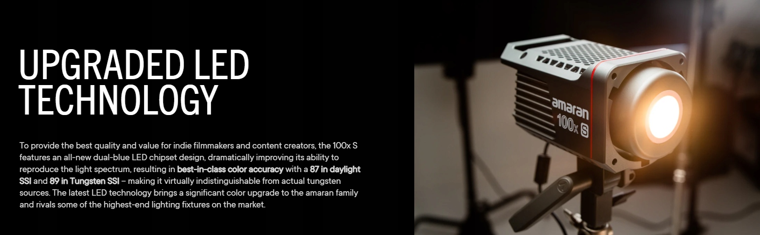 Amaran 100x S-оновлена версія ідеально прийнятої 100-ватної лампи Amaran 100x, створена для творців відео та фотографів. Ця модель заснована на вдосконаленому світлодіодному чіпсеті, що забезпечує чудову якість світла та неперевершену точність у пожертвуванні кольорів. Це підтверджується, серед інших Високі показники SSI - D32 (89+) та D56 (87+). За допомогою таких параметрів лампа може конкурувати з набагато дорожчими моделями пристроїв, які використовуються у світі професійних відеопроектів.